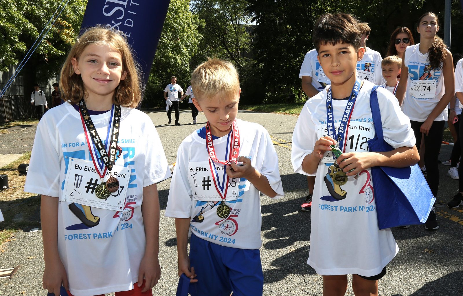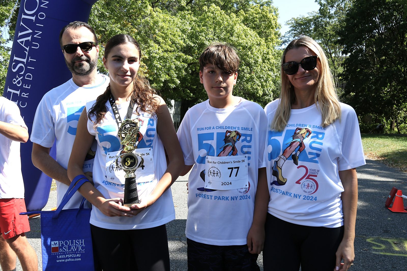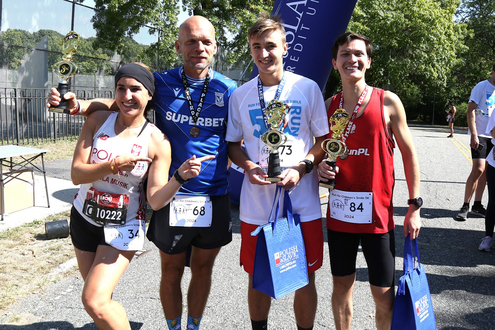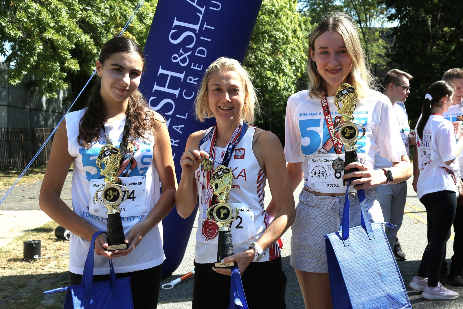 Na mecie na zwycięzców czekały medale i trofea, a na najmłodszych dodatkowo medale uczestnictwa w 8. edycji “Biegu o Uśmiech Dziecka”, którymi wyróżniono wszystkie dzieci. Zawodnicy biorący udział w biegu otrzymali także okolicznościowe koszulki. Były również prezenty ufundowane przez Polsko-Słowiańską Federalną Unię Kredytową, które wręczyły przedstawicielki oddziału z Maspeth – Elżbieta Ringer i Joanna Januszewska.
