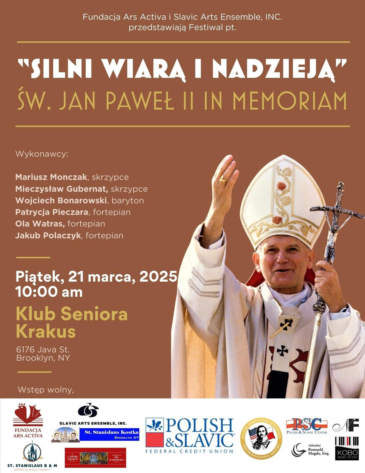 Krakus Senior Center PSC, działający przy The Polish & Slavic Center (PSC)zaprasza na koncert “Silni wiarą i nadzieją”, który odbędzie się 21 marca o godzinie 10:00. Wydarzenie odbędzie się na stołówce Klubu Seniora Krakus, 176 Java Street. Serdecznie zapraszamy!