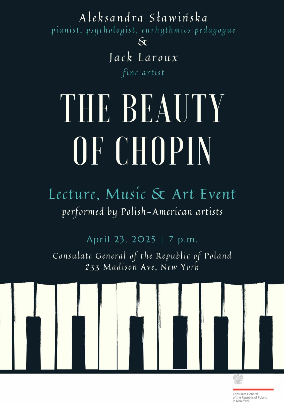 Serdecznie zapraszamy do wzięcia udziału w niezwykłym wydarzeniu artystycznym, które odbędzie się w Konsulacie RP w Nowym Jorku. Będzie to wyjątkowa okazja do odkrycia twórczości Fryderyka Chopina z nowej, holistycznej perspektywy, zaprezentowanej przez Aleksandrę Sławińską – pianistkę, psycholożkę i pedagoga rytmiki, oraz Jacka Laroux – artystę plastyka.