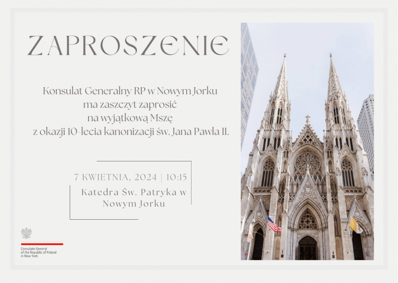 Zapraszamy na Mszę Świętą zorganizowaną przez Konsulat Generalny RP w Nowym Jorku ku czci św. Jana Pawła II, w niedzielę 7 kwietnia 2024 r. o godz. 10:15 w katedrze św. Patryka na Manhattanie