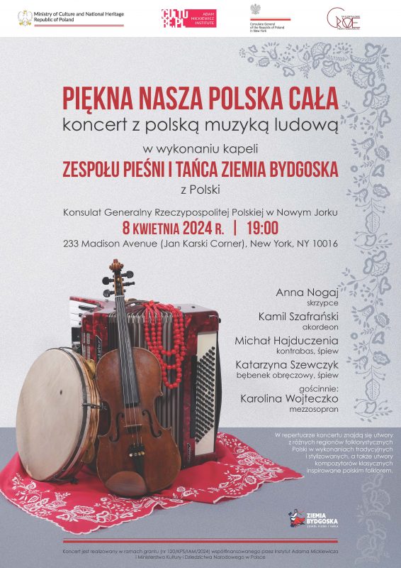 Zapraszamy na koncert „Piękna nasza Polska cała” w wykonaniu kapeli Zespołu Pieśni i Tańca Ziemia Bydgoska, 8 kwietnia 2024