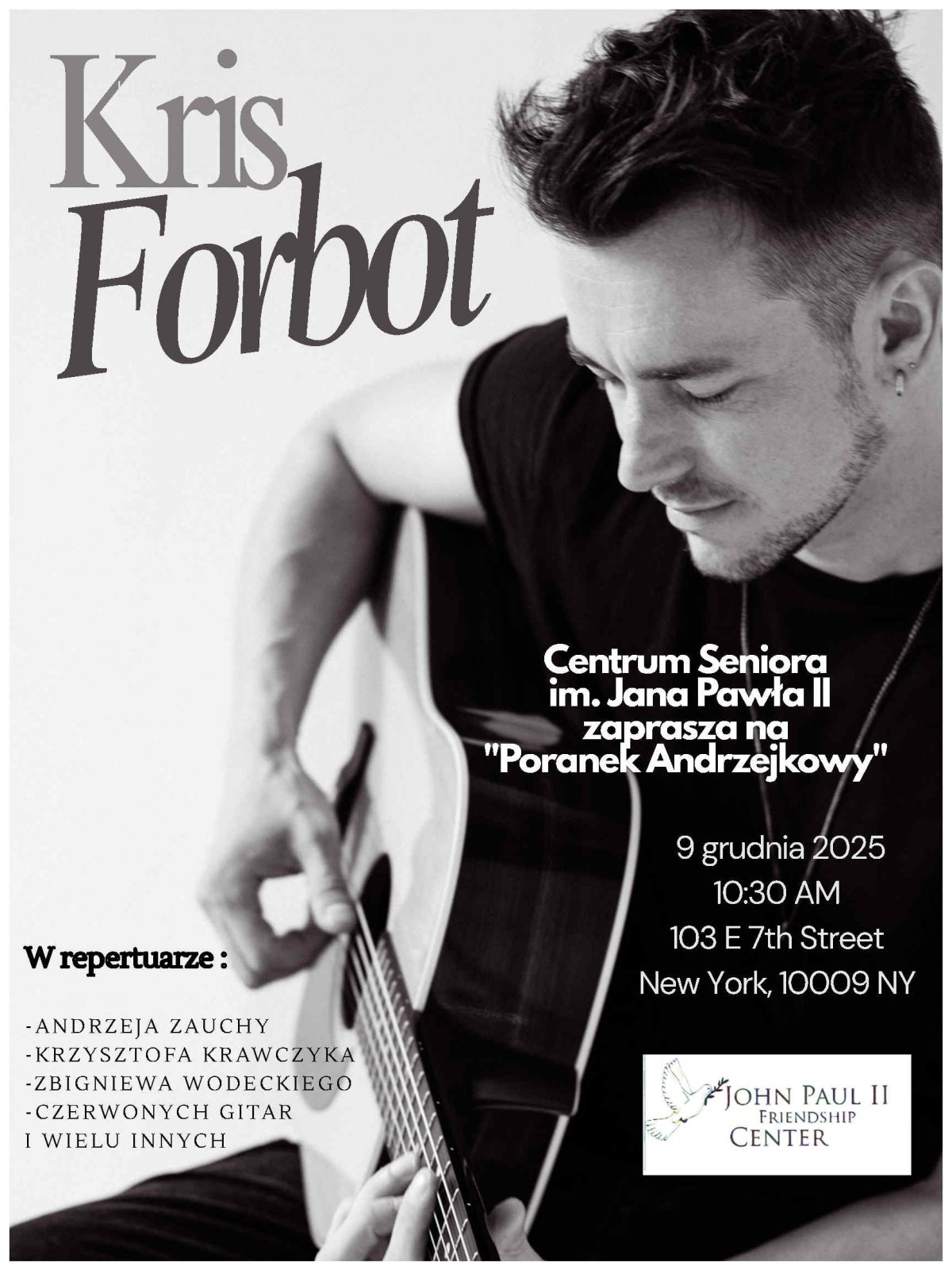 KLUB SENIORA-JP II, POZOSTAŁE WYDARZENIACentrum Seniora im. Jana Pawła II zaprasza na “Poranek Andrzejkowy” 9 grudnia 2025 , godz. 10:30 AM, 103 E 7th Str, New York Posted on December 1, 2025December 1, 2025 by Administrator
