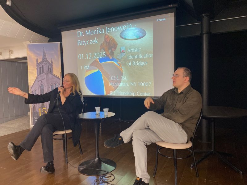 1 grudnia w Klubie im. Jana Pawła II działającym przy Centrum Polsko-Słowiańskim odbył się wykład–prezentacja dr Moniki Jenowein – badaczki, edukatorki i animatorki kultury, która od lat zajmuje się tematyką relacji międzyludzkich, komunikacji oraz społecznych mostów łączących pokolenia. Dr Jenowein, przebywająca przez ostatnie dwa miesiące na rezydencji artystycznej, podzieliła się także swoimi refleksjami na temat instalacji artystycznej „Sztuka Połączeń. Identyfikacja Połączeń Mostów”, prezentowanej w Centrum Seniora im. Jana Pawła II. Jest to projekt, który w wyjątkowy sposób łączy sztukę ze społeczną misją, a jego główna idea koncentruje się na budowaniu mostów między ludźmi – zarówno symbolicznie, jak i praktycznie.