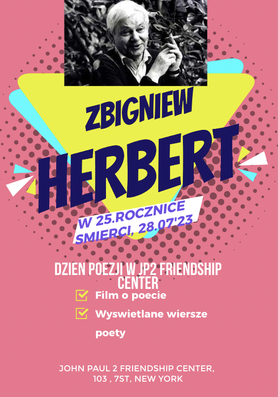 Z racji 25 rocznicy śmierci Zbigniewa Herberta w Dniu 28 lipca 2023 w centrum Seniora im. JP2 beda prezentowane wiersze i film o artyście.