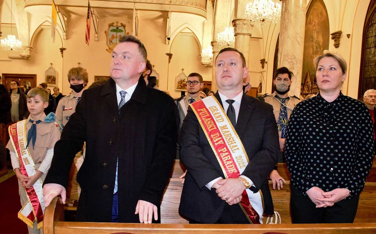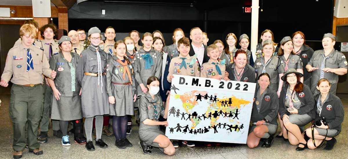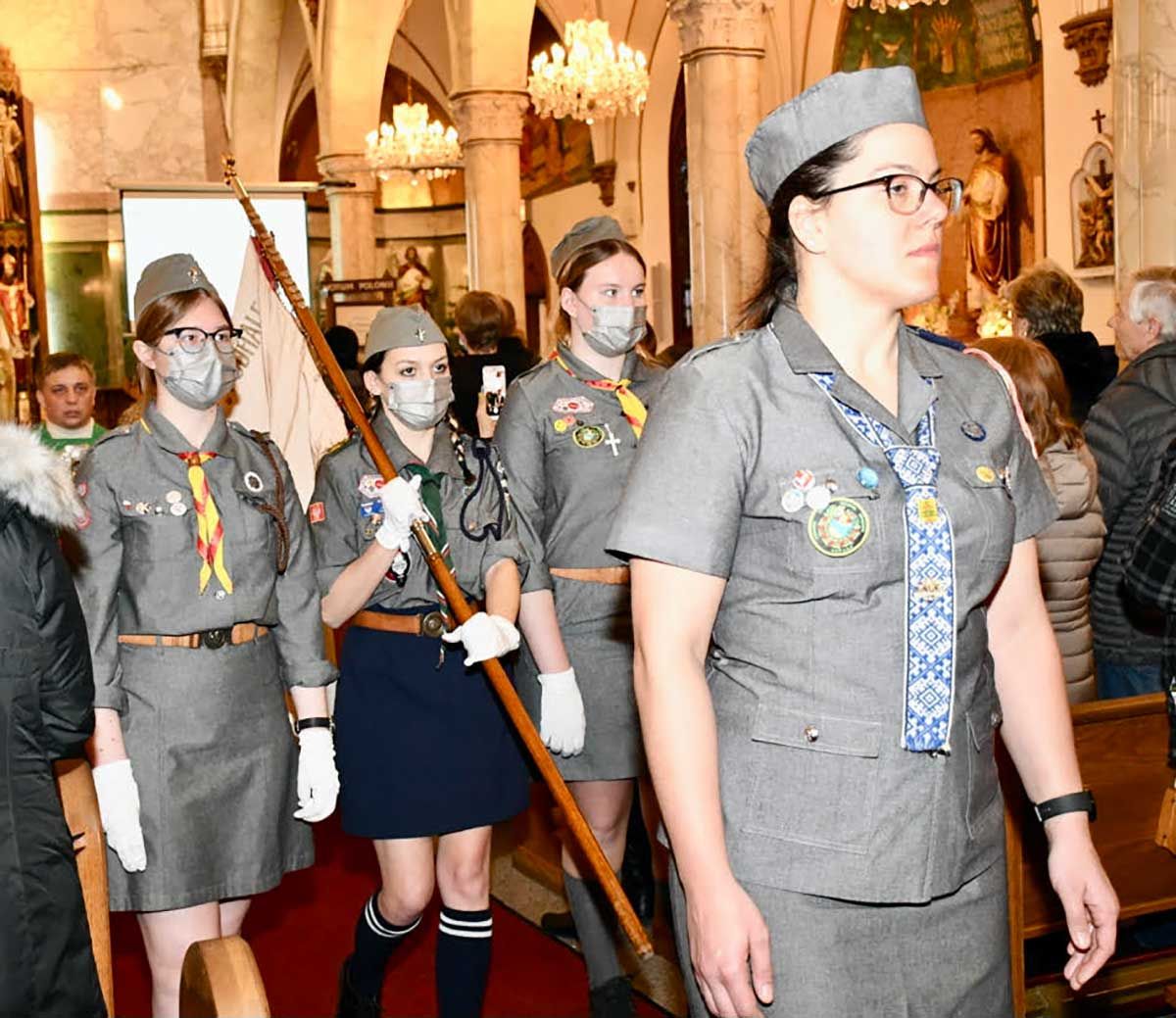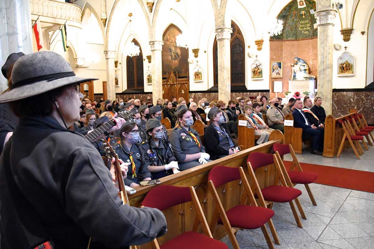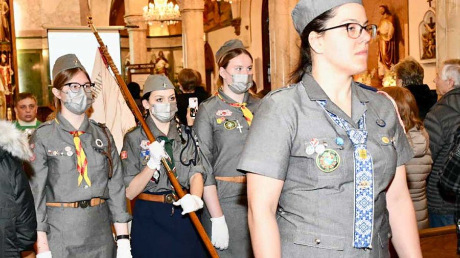 Na kominku przy symbolicznym ognisku odbył się kominek harcerski oraz ciekawy obrzęd upamiętnienia Światowego Święta Skautowego. Każdy uczestnik, harcerki, harcerze i grono instruktorskie i goście, wycięli z papieru “ludzika” reprezentującego siebie i przykleił na mapę świata. W ten sposób symbolicznie okrążyliśmy świat wielkim braterskim kołem. Gośćmi specjalnymi byli Wice Konsul Mateusz Gmura oraz Wielki Marszałek Parady Pulaskiego 2022, Marcin Luc z żoną Magdaleną i synami, Aleksem i Sebastianem – harcerzami. To oni wnieśli dary – krzyż harcerski i biało czerwony bukiet.