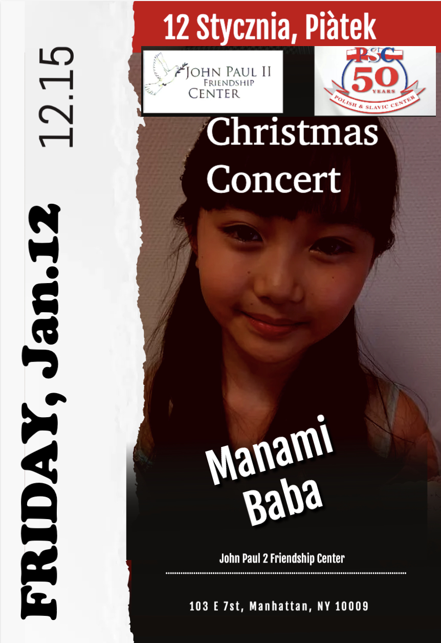 Zapraszamy na koncert noworoczny w Centrum Seniora im. Jana Pawła 2, w wykonaniu młodej japońsko-amerykańskiej wokalistki: Manami Baba ,12 stycznia, piàtek o godzinie 12.15.