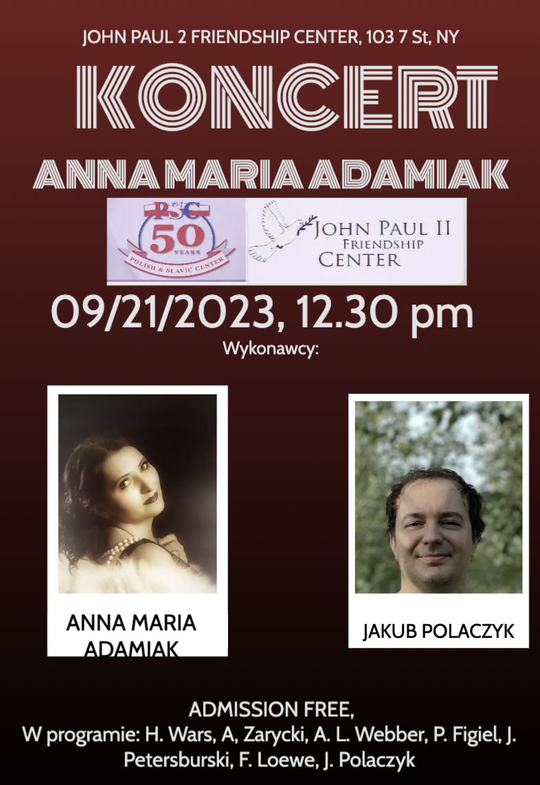 Centrum JP2 na Manhattanie zaprasza na koncert uznanej śpiewaczki operowej, operetkowej, musicalowej ANNY MARII ADAMIAK. Artystce będzie towarzyszyć na pianinie Jakub Polaczyk. ZAPRASZAMY.