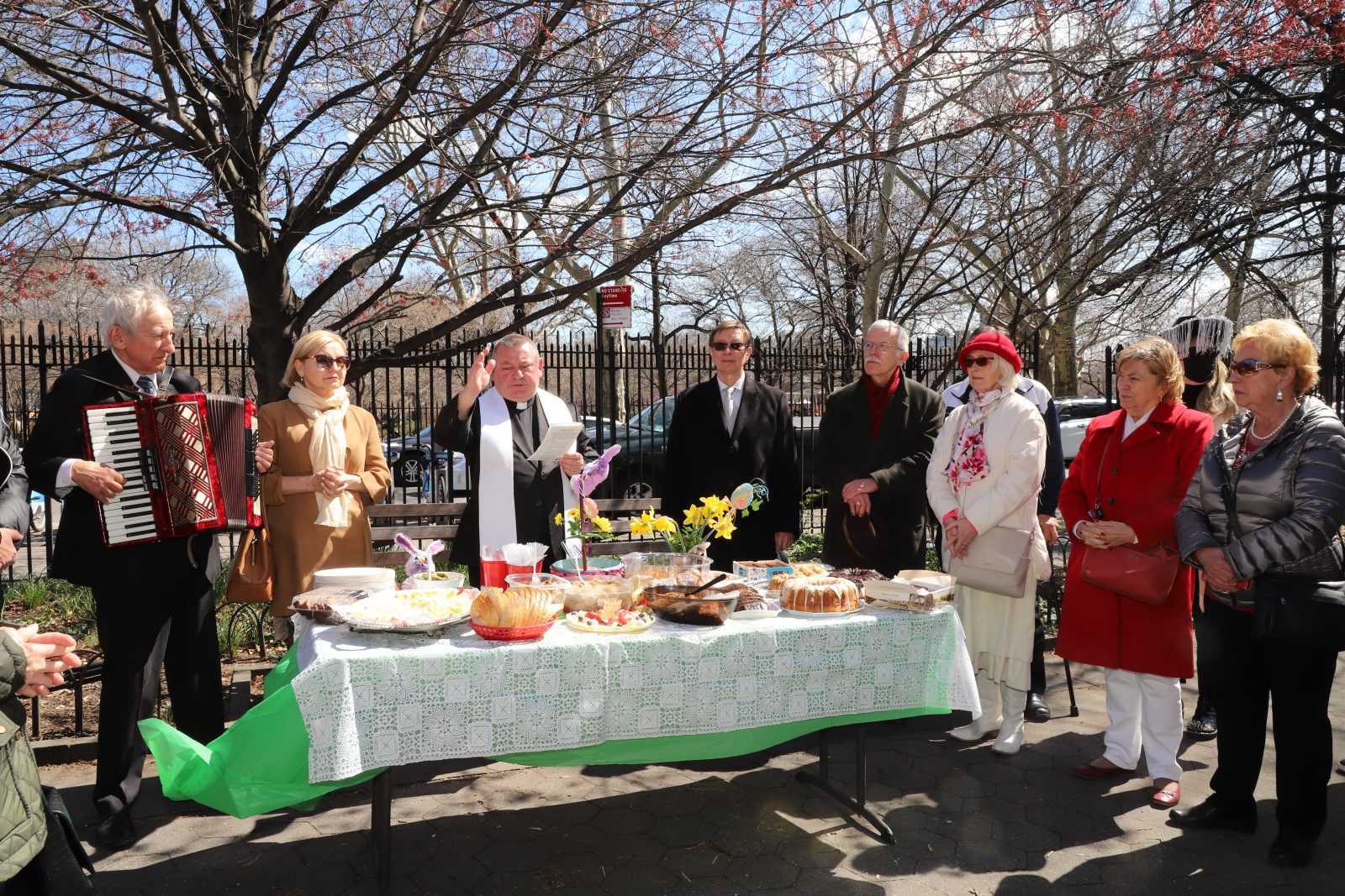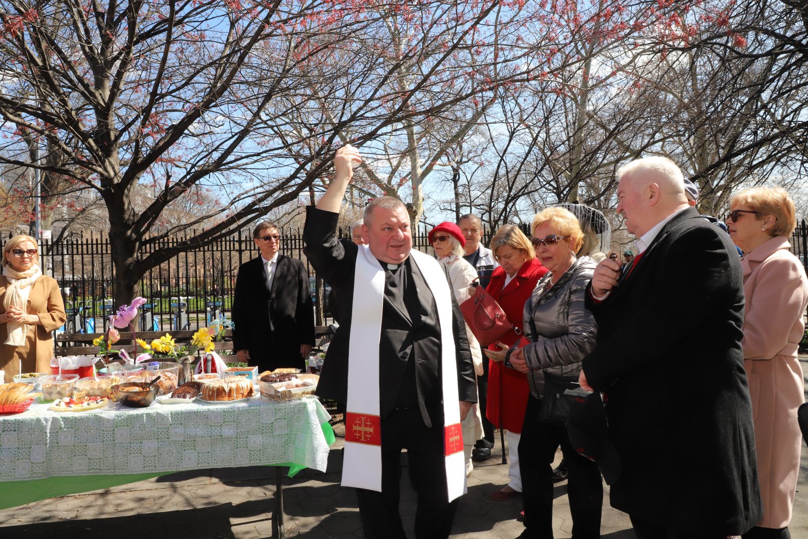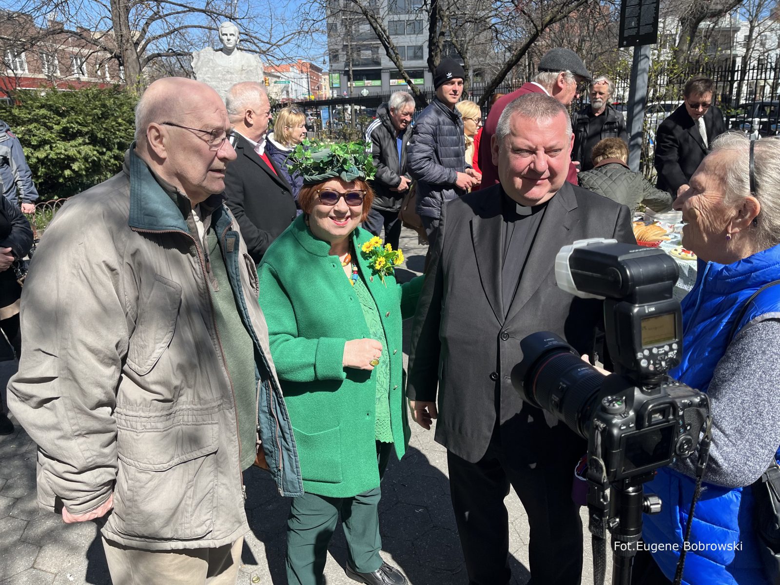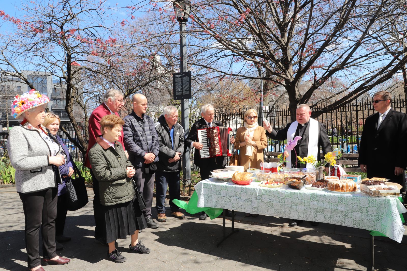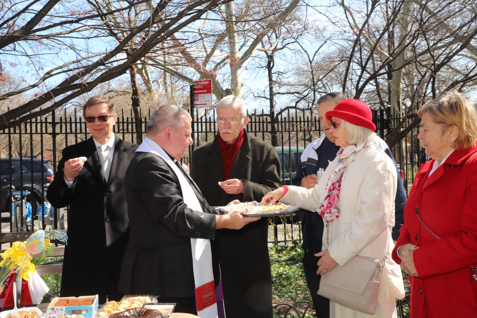 Z inicjatywy seniorów Klubu Krakus działającego w Centrum Polsko Słowiańskim, w niedzielę wielkanocną, 31 marca miało miejsce trzecie już spotkanie przy pomniku księdza Jerzego Popiełuszki na Greenpoincie. Uczestniczyli w nim również członkowie Northside Senior Center z Williamsburga, znajomi oraz przygodni przechodnie. Obecnością swoją zaszczycili nas: prezes Centrum Polsko Słowiańskiego, Marian Żak z małżonką Małgorzatą, nowy prezes Polsko-Amerykańskiego Klubu Fotografika, Dariusz Kanarek, który przybył z ojcem, Krzysztofem Kanarkiem, byłym śpiewakiem z Mazowsza i solistą Operetki Warszawskiej. Zaproszony ksiądz Grzegorz Markulak, proboszcz Parafii Św. Stanisława Kostki na Greenpoincie powiedział „Po zakończeniu 40 dniowego czasu Wielkiego Postu gromadzimy się w Uroczystość Zmartwychwstania Pańskiego. W naszych sercach jest wielka radość, bo Chrystus żyje i jest pośród nas. Razem z nim jesteśmy tu w tej wspólnocie przy Wielkanocnym stole, by dzielić się miłością, składać sobie wzajemnie życzenia, dzielić się poświęconym jajkiem, znakiem nowego życia. Prośmy Chrystusa zawsze obecnego wśród tych, którzy Go miłują, aby pobłogosławił pokarmy na naszym wielkanocnym stole”. Po odmówieniu Litanii dziękczynnej i modlitwy poświęcił pokarmy wielkanocne oraz pobłogosławił zebranych.