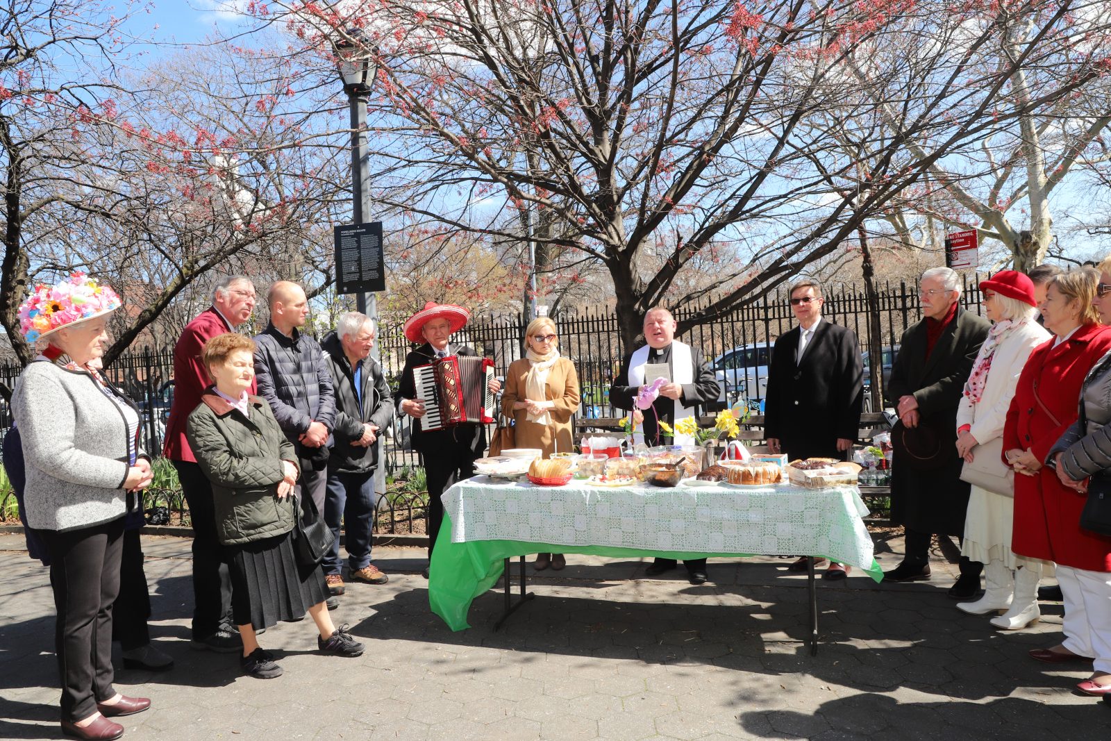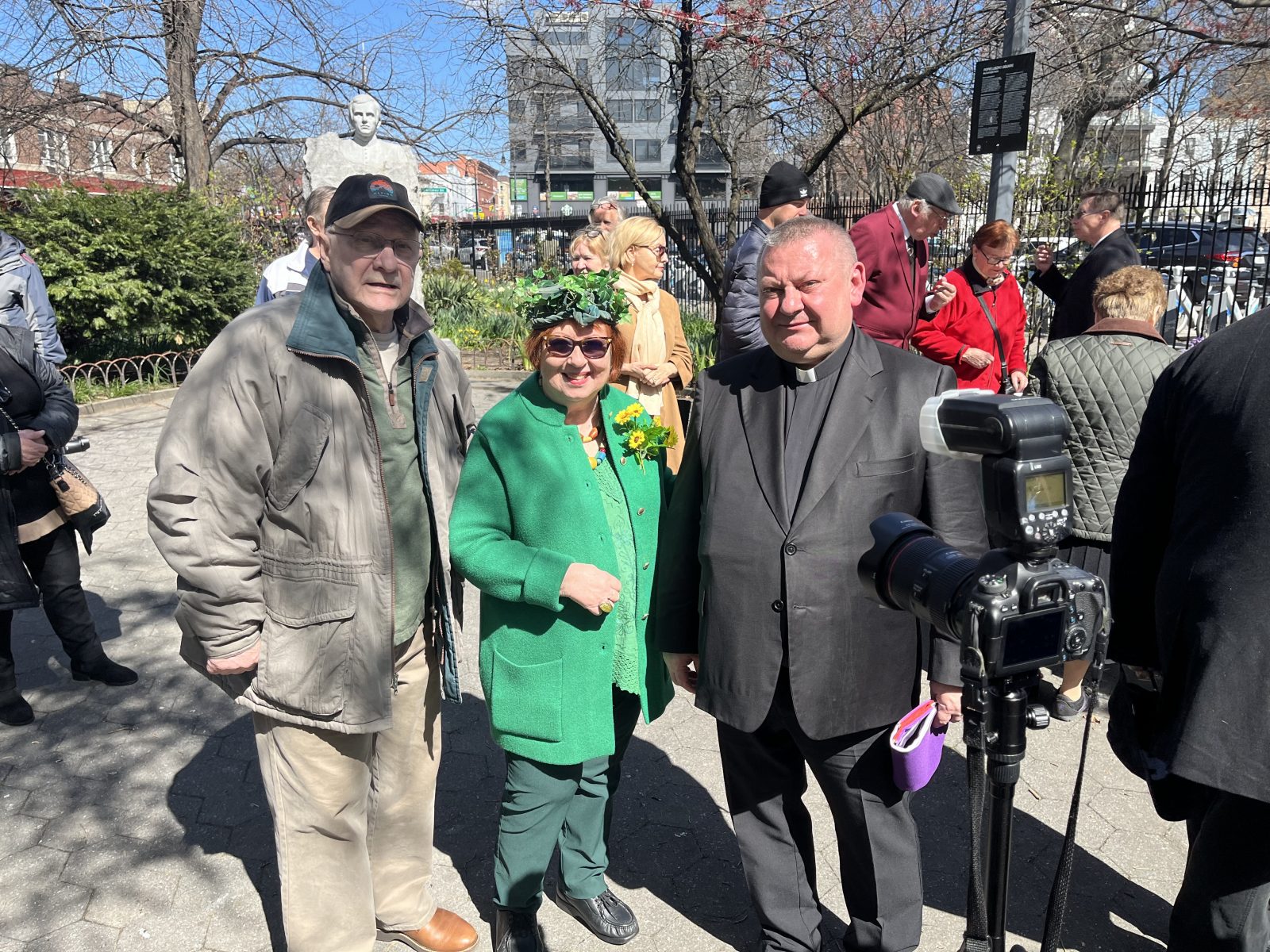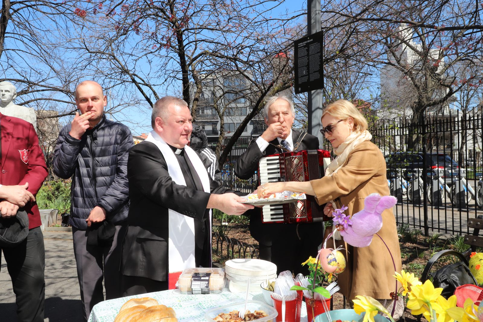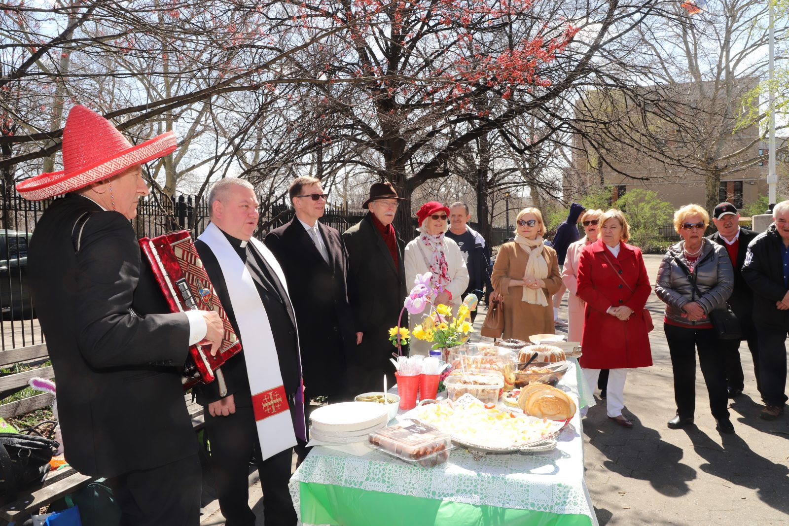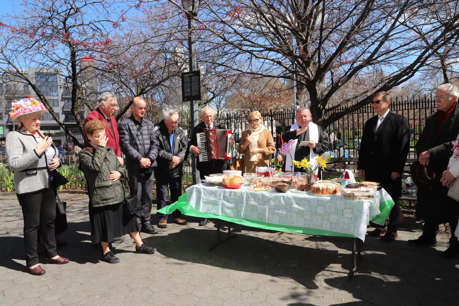 Z inicjatywy seniorów Klubu Krakus działającego w Centrum Polsko Słowiańskim, w niedzielę wielkanocną, 31 marca miało miejsce trzecie już spotkanie przy pomniku księdza Jerzego Popiełuszki na Greenpoincie. Uczestniczyli w nim również członkowie Northside Senior Center z Williamsburga, znajomi oraz przygodni przechodnie. Obecnością swoją zaszczycili nas: prezes Centrum Polsko Słowiańskiego, Marian Żak z małżonką Małgorzatą, nowy prezes Polsko-Amerykańskiego Klubu Fotografika, Dariusz Kanarek, który przybył z ojcem, Krzysztofem Kanarkiem, byłym śpiewakiem z Mazowsza i solistą Operetki Warszawskiej. Zaproszony ksiądz Grzegorz Markulak, proboszcz Parafii Św. Stanisława Kostki na Greenpoincie powiedział „Po zakończeniu 40 dniowego czasu Wielkiego Postu gromadzimy się w Uroczystość Zmartwychwstania Pańskiego. W naszych sercach jest wielka radość, bo Chrystus żyje i jest pośród nas. Razem z nim jesteśmy tu w tej wspólnocie przy Wielkanocnym stole, by dzielić się miłością, składać sobie wzajemnie życzenia, dzielić się poświęconym jajkiem, znakiem nowego życia. Prośmy Chrystusa zawsze obecnego wśród tych, którzy Go miłują, aby pobłogosławił pokarmy na naszym wielkanocnym stole”. Po odmówieniu Litanii dziękczynnej i modlitwy poświęcił pokarmy wielkanocne oraz pobłogosławił zebranych.