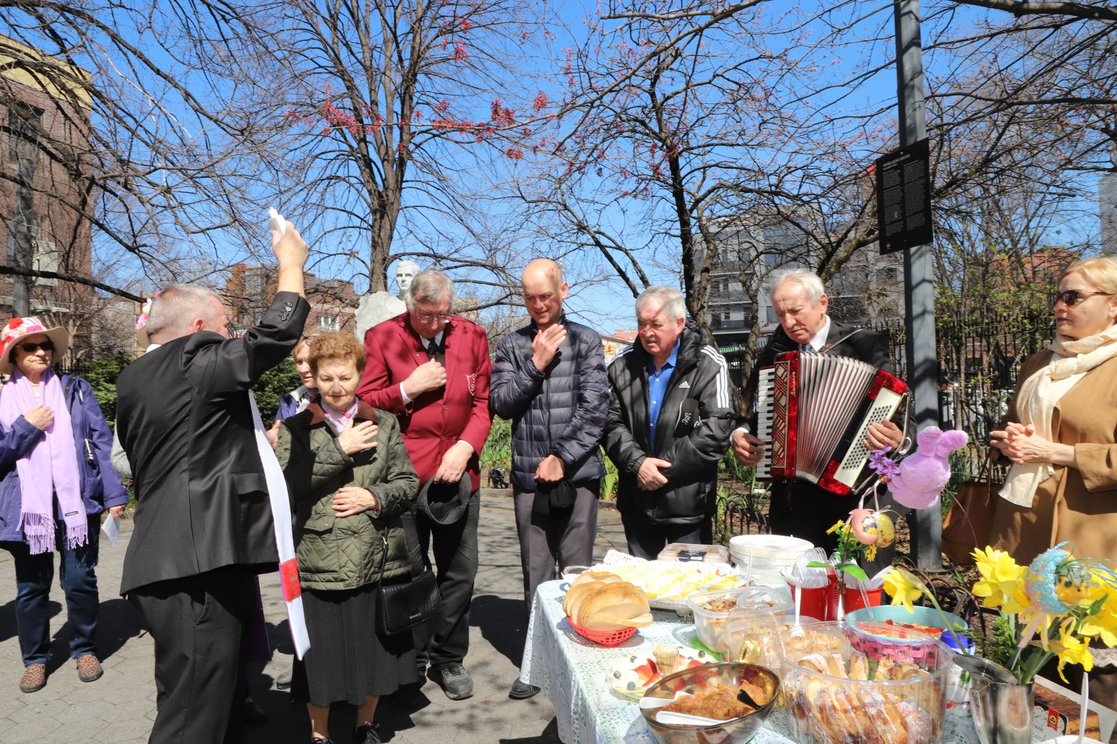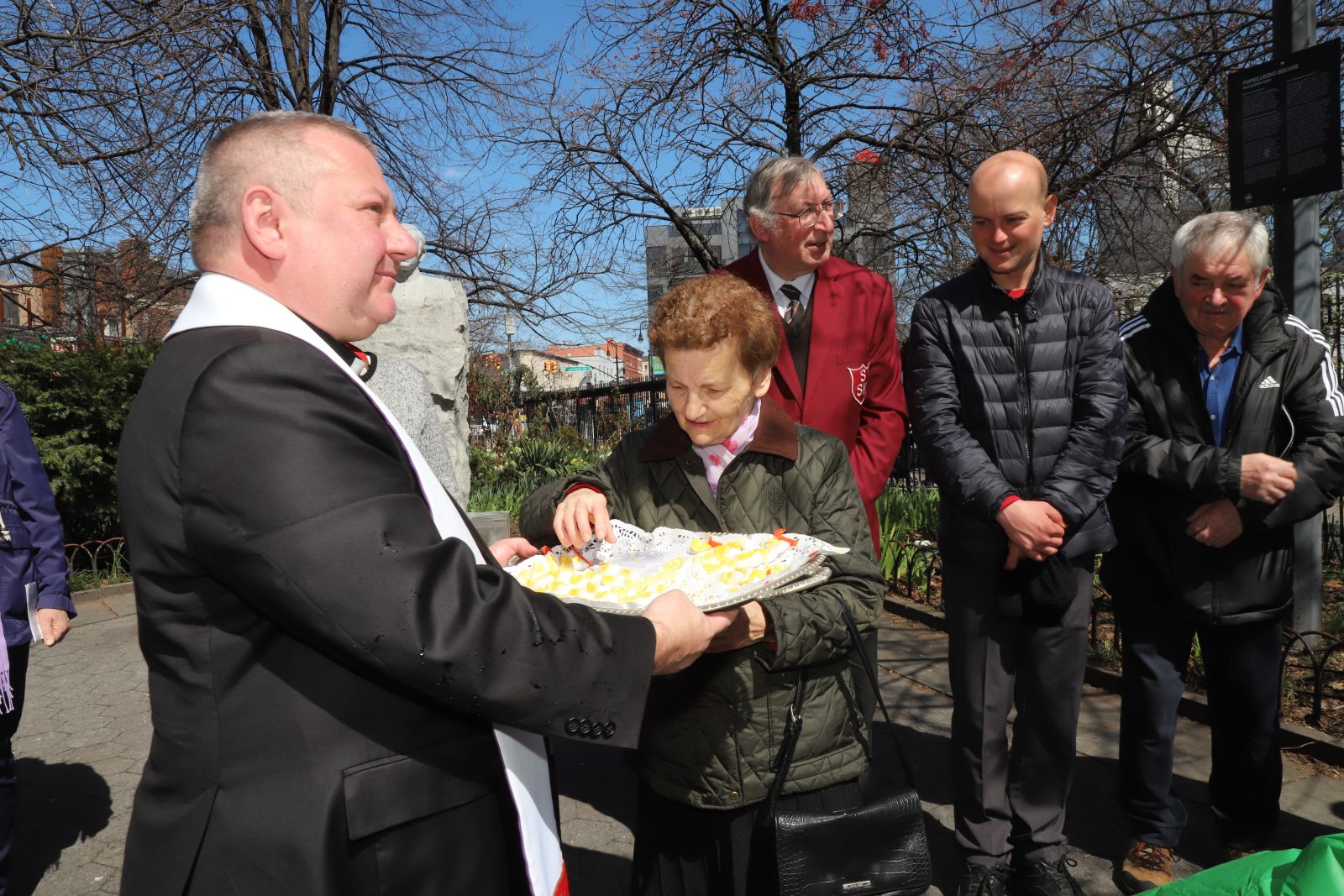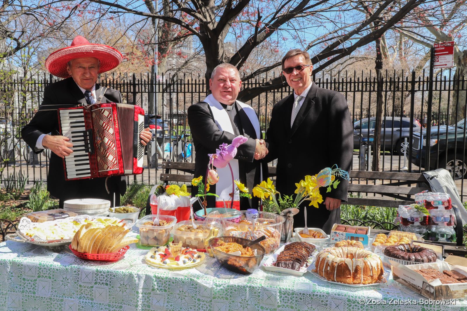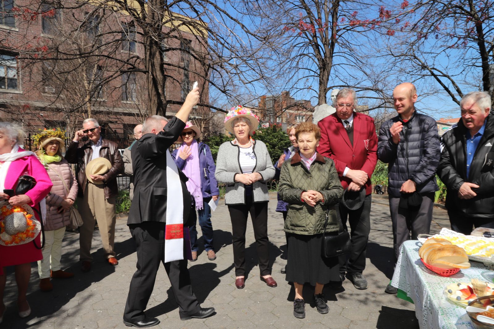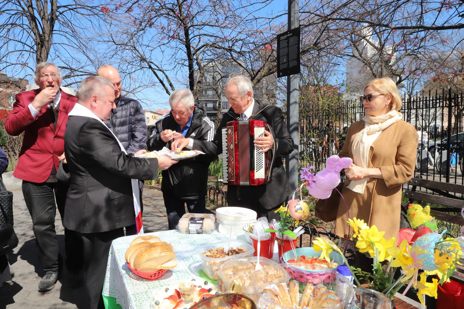 Z inicjatywy seniorów Klubu Krakus działającego w Centrum Polsko Słowiańskim, w niedzielę wielkanocną, 31 marca miało miejsce trzecie już spotkanie przy pomniku księdza Jerzego Popiełuszki na Greenpoincie. Uczestniczyli w nim również członkowie Northside Senior Center z Williamsburga, znajomi oraz przygodni przechodnie. Obecnością swoją zaszczycili nas: prezes Centrum Polsko Słowiańskiego, Marian Żak z małżonką Małgorzatą, nowy prezes Polsko-Amerykańskiego Klubu Fotografika, Dariusz Kanarek, który przybył z ojcem, Krzysztofem Kanarkiem, byłym śpiewakiem z Mazowsza i solistą Operetki Warszawskiej. Zaproszony ksiądz Grzegorz Markulak, proboszcz Parafii Św. Stanisława Kostki na Greenpoincie powiedział „Po zakończeniu 40 dniowego czasu Wielkiego Postu gromadzimy się w Uroczystość Zmartwychwstania Pańskiego. W naszych sercach jest wielka radość, bo Chrystus żyje i jest pośród nas. Razem z nim jesteśmy tu w tej wspólnocie przy Wielkanocnym stole, by dzielić się miłością, składać sobie wzajemnie życzenia, dzielić się poświęconym jajkiem, znakiem nowego życia. Prośmy Chrystusa zawsze obecnego wśród tych, którzy Go miłują, aby pobłogosławił pokarmy na naszym wielkanocnym stole”. Po odmówieniu Litanii dziękczynnej i modlitwy poświęcił pokarmy wielkanocne oraz pobłogosławił zebranych.