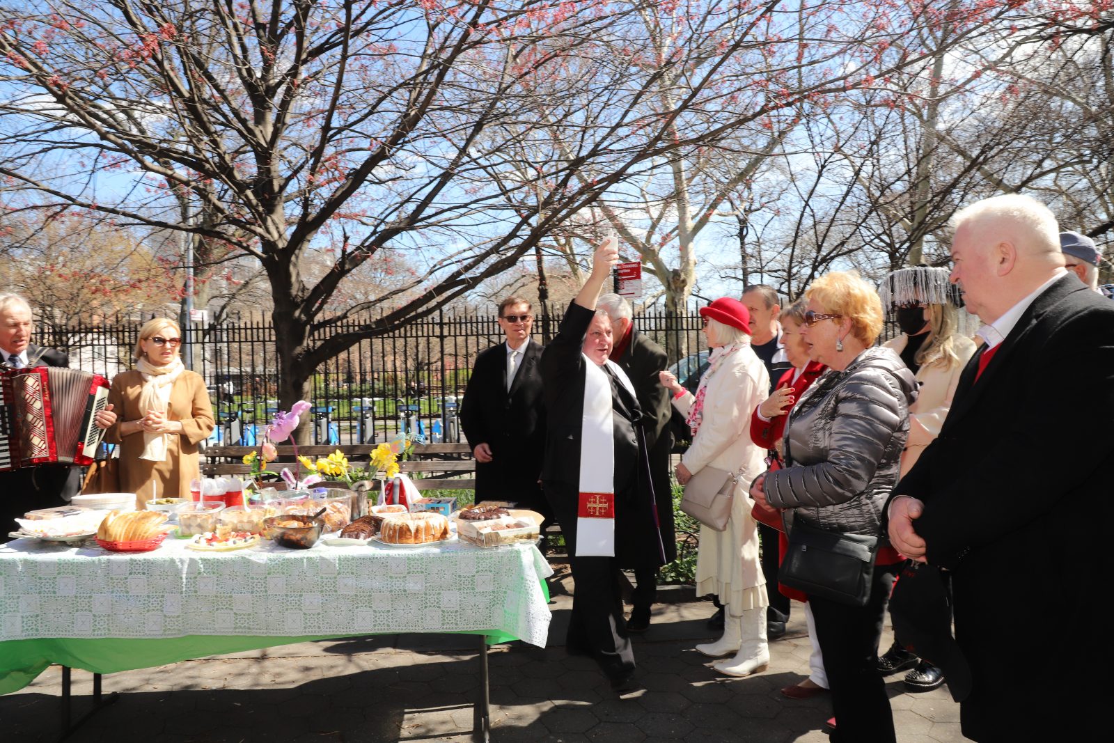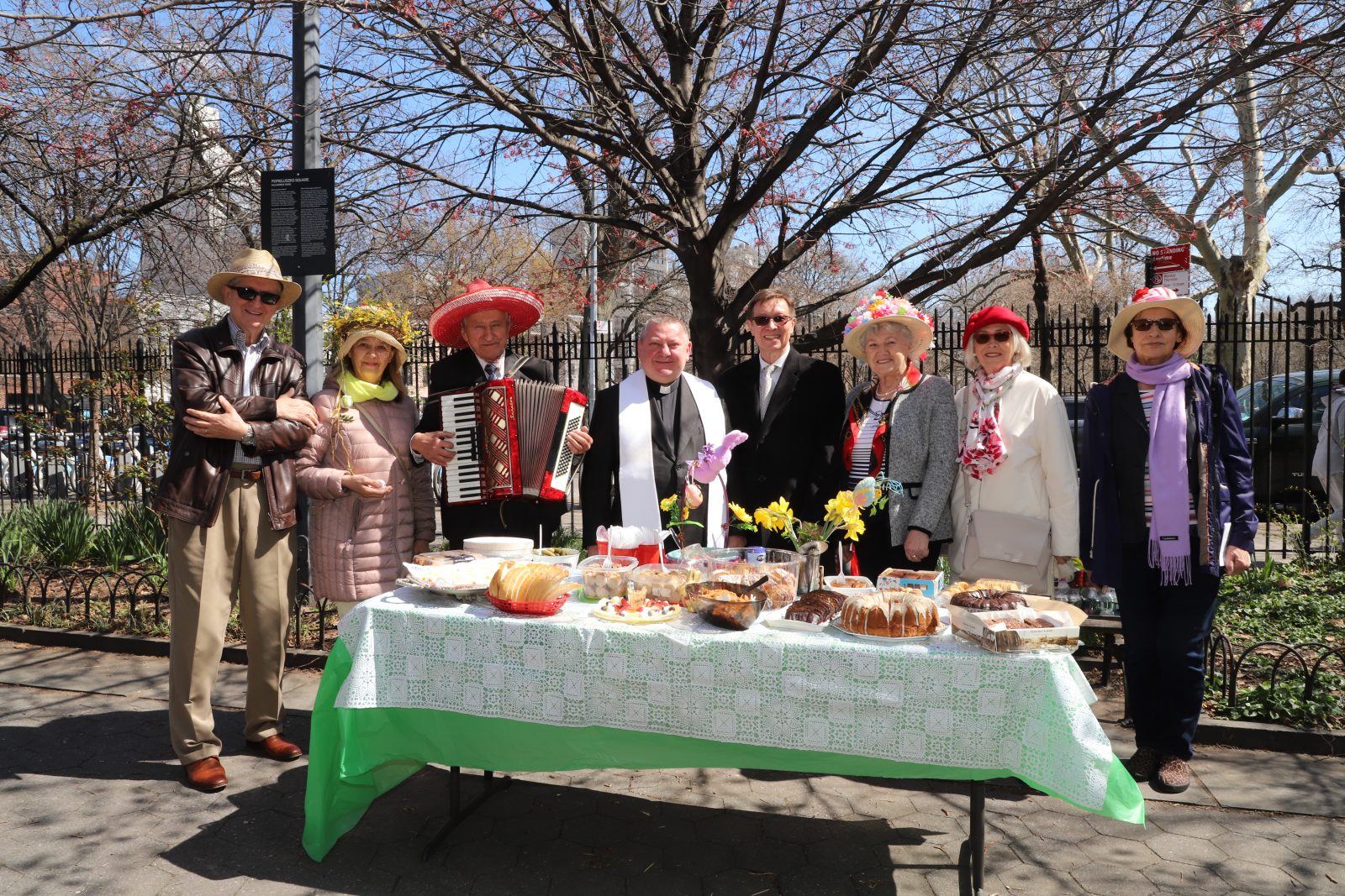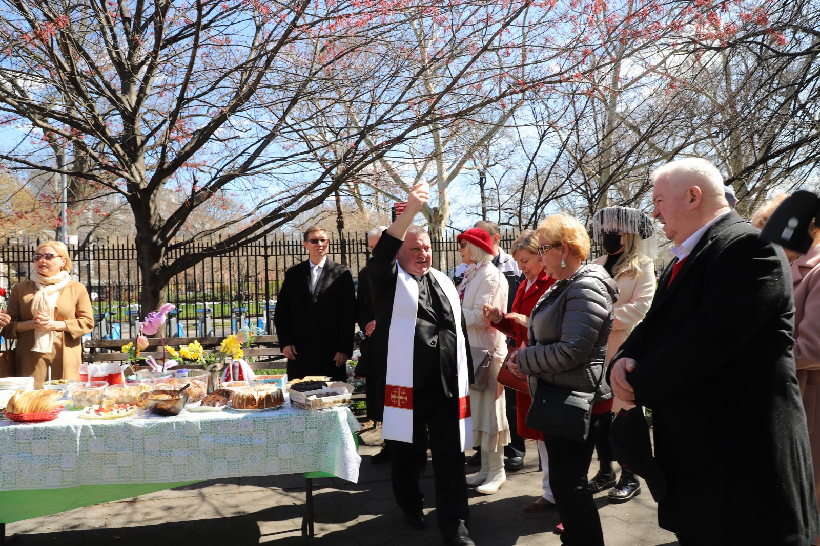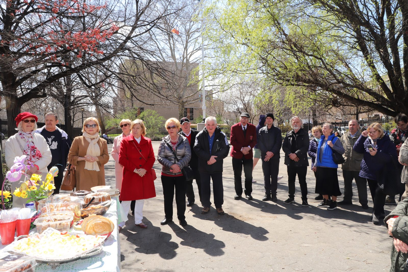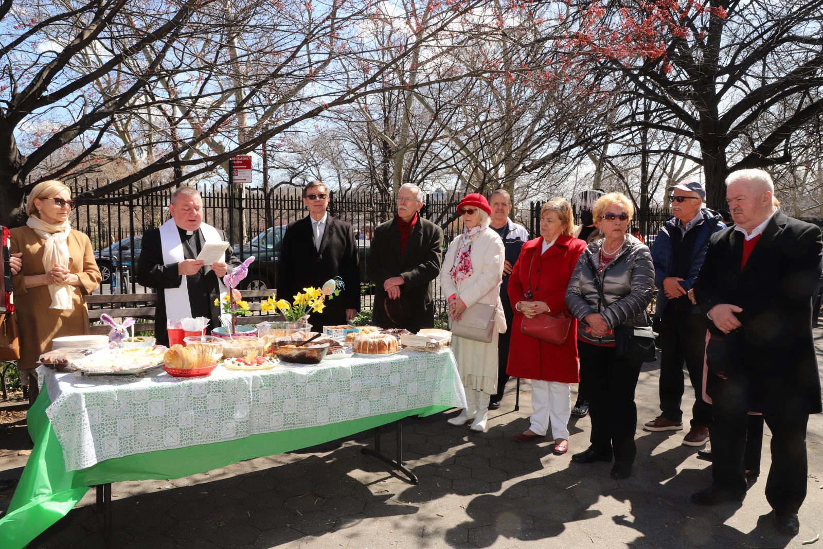 Z inicjatywy seniorów Klubu Krakus działającego w Centrum Polsko Słowiańskim, w niedzielę wielkanocną, 31 marca miało miejsce trzecie już spotkanie przy pomniku księdza Jerzego Popiełuszki na Greenpoincie. Uczestniczyli w nim również członkowie Northside Senior Center z Williamsburga, znajomi oraz przygodni przechodnie. Obecnością swoją zaszczycili nas: prezes Centrum Polsko Słowiańskiego, Marian Żak z małżonką Małgorzatą, nowy prezes Polsko-Amerykańskiego Klubu Fotografika, Dariusz Kanarek, który przybył z ojcem, Krzysztofem Kanarkiem, byłym śpiewakiem z Mazowsza i solistą Operetki Warszawskiej. Zaproszony ksiądz Grzegorz Markulak, proboszcz Parafii Św. Stanisława Kostki na Greenpoincie powiedział „Po zakończeniu 40 dniowego czasu Wielkiego Postu gromadzimy się w Uroczystość Zmartwychwstania Pańskiego. W naszych sercach jest wielka radość, bo Chrystus żyje i jest pośród nas. Razem z nim jesteśmy tu w tej wspólnocie przy Wielkanocnym stole, by dzielić się miłością, składać sobie wzajemnie życzenia, dzielić się poświęconym jajkiem, znakiem nowego życia. Prośmy Chrystusa zawsze obecnego wśród tych, którzy Go miłują, aby pobłogosławił pokarmy na naszym wielkanocnym stole”. Po odmówieniu Litanii dziękczynnej i modlitwy poświęcił pokarmy wielkanocne oraz pobłogosławił zebranych.