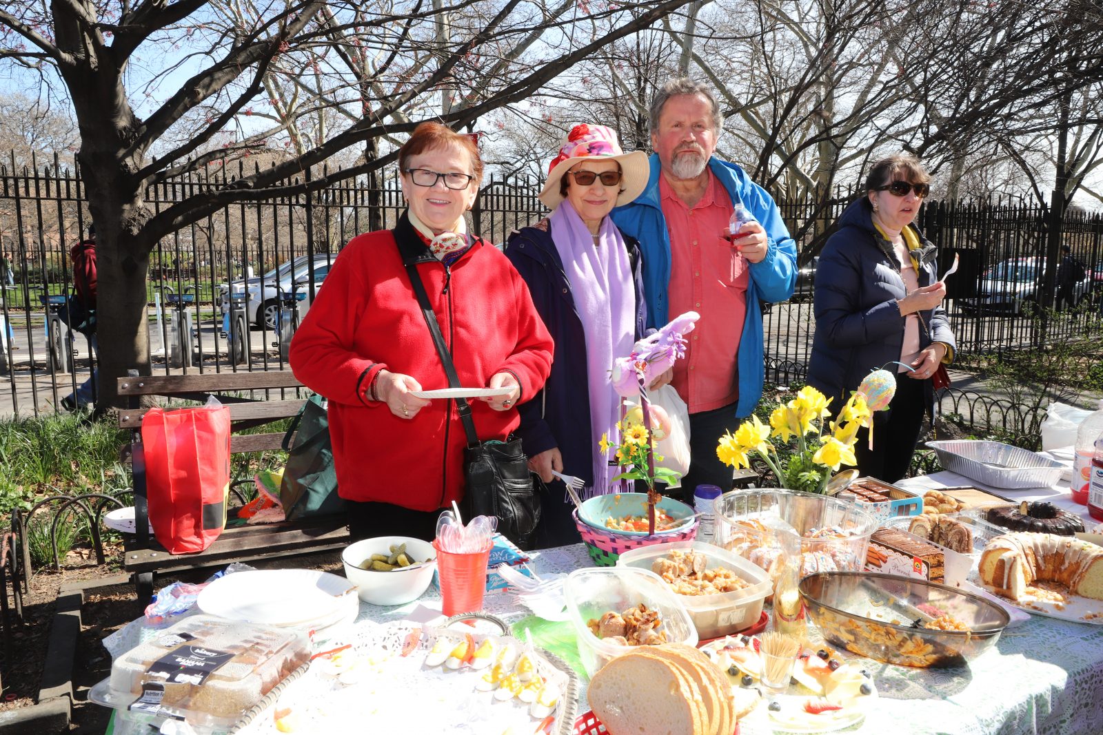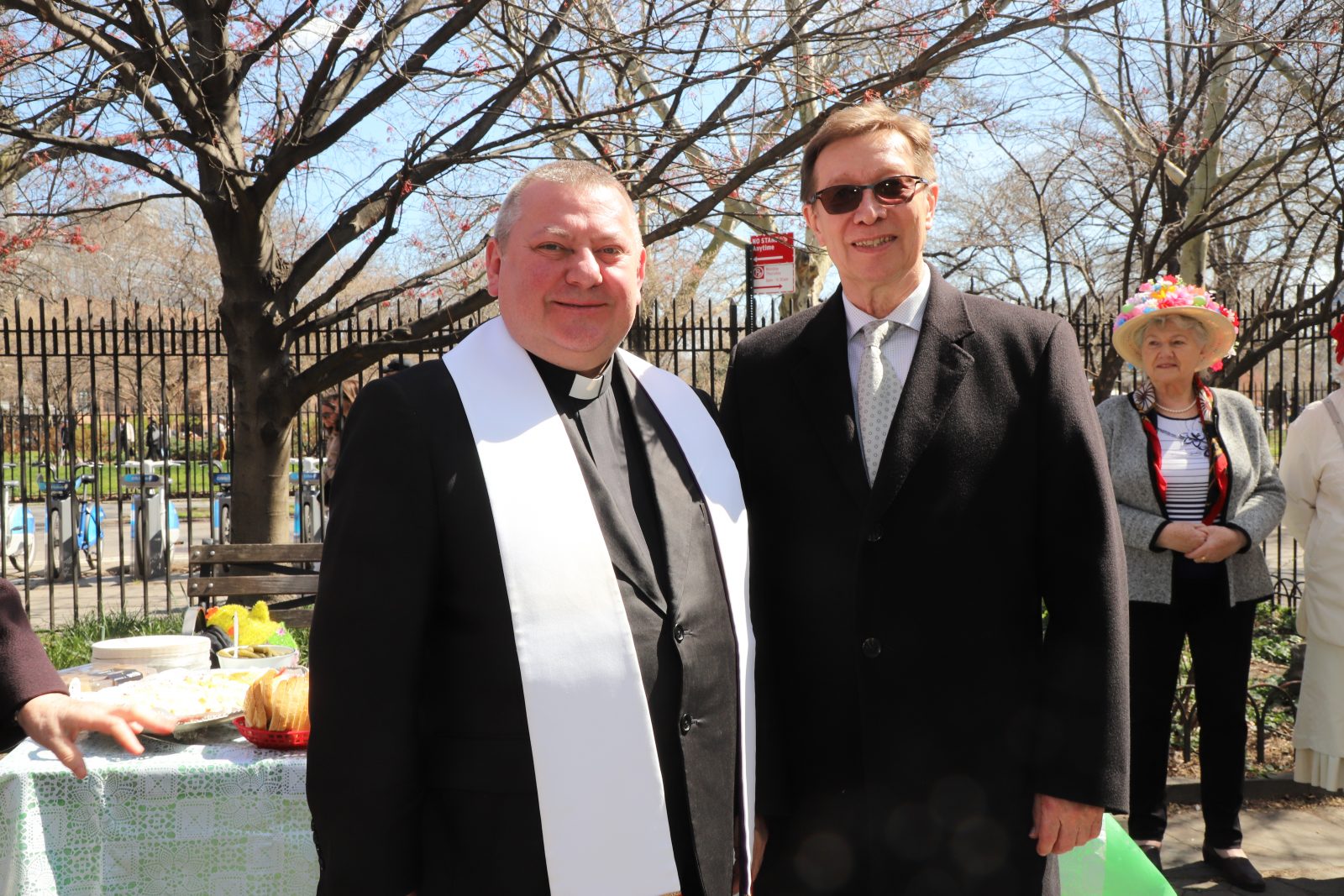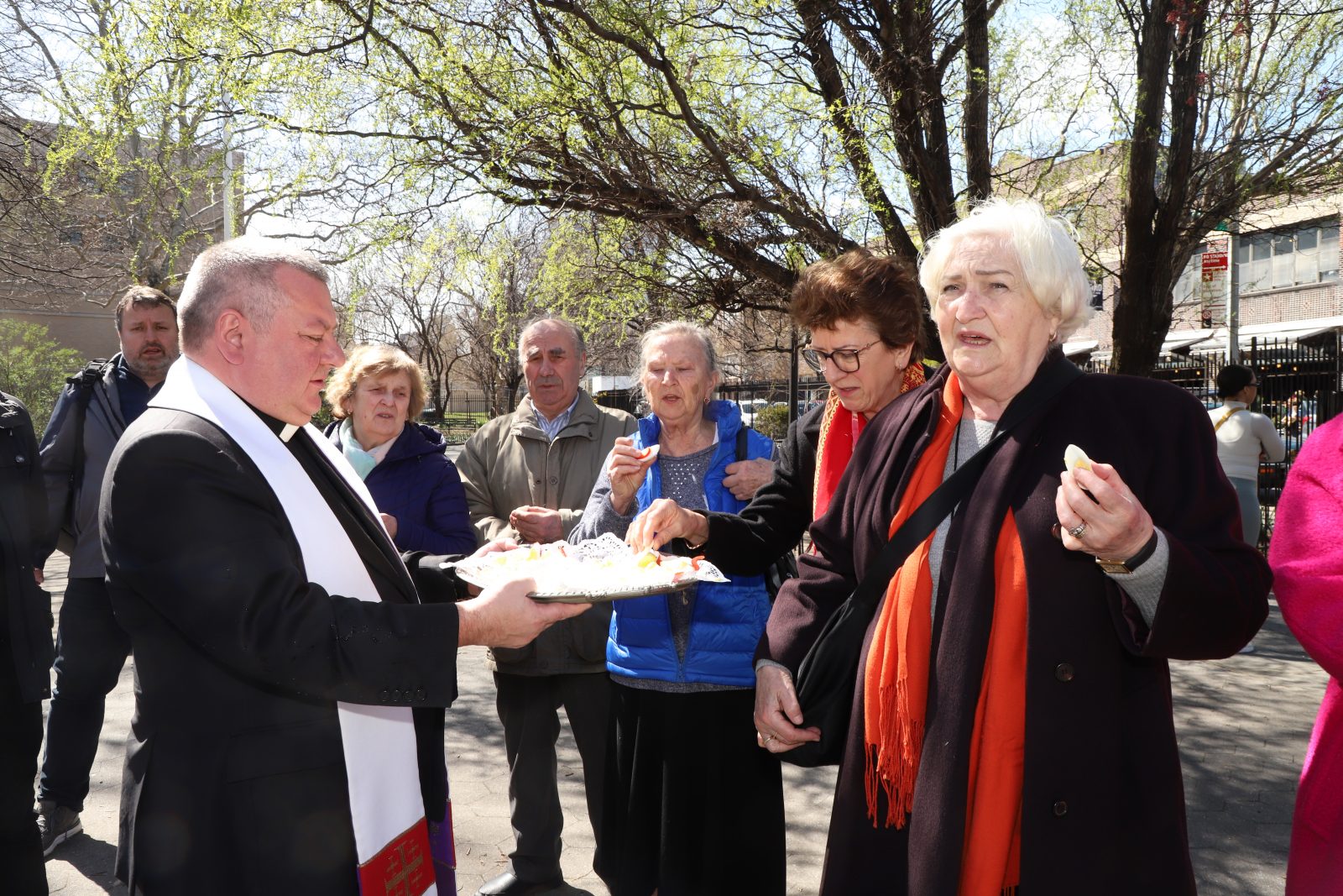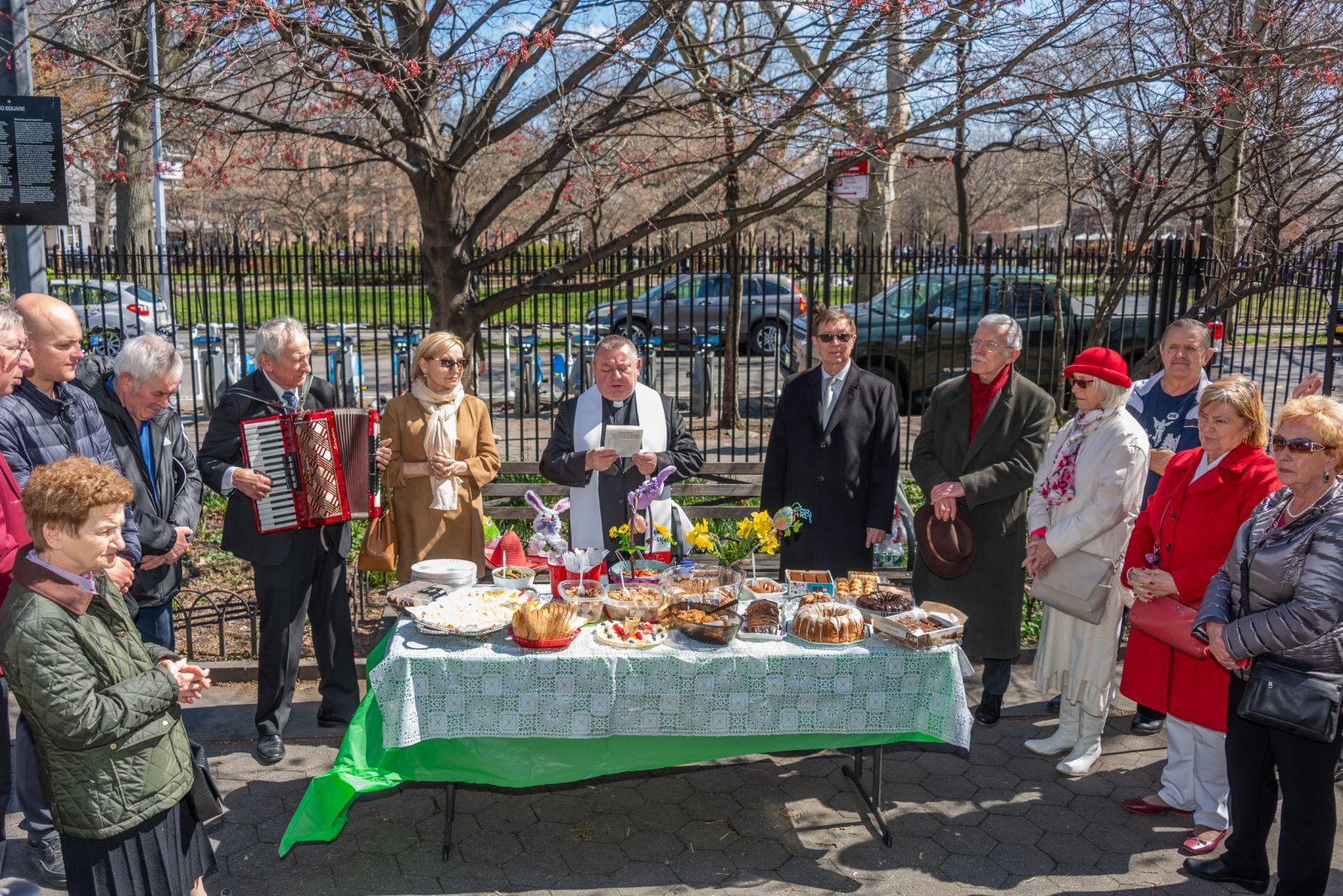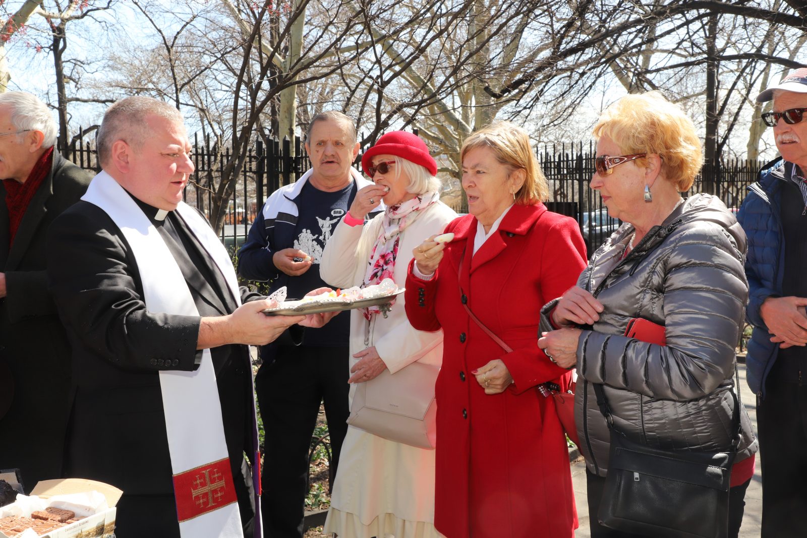 Z inicjatywy seniorów Klubu Krakus działającego w Centrum Polsko Słowiańskim, w niedzielę wielkanocną, 31 marca miało miejsce trzecie już spotkanie przy pomniku księdza Jerzego Popiełuszki na Greenpoincie. Uczestniczyli w nim również członkowie Northside Senior Center z Williamsburga, znajomi oraz przygodni przechodnie. Obecnością swoją zaszczycili nas: prezes Centrum Polsko Słowiańskiego, Marian Żak z małżonką Małgorzatą, nowy prezes Polsko-Amerykańskiego Klubu Fotografika, Dariusz Kanarek, który przybył z ojcem, Krzysztofem Kanarkiem, byłym śpiewakiem z Mazowsza i solistą Operetki Warszawskiej. Zaproszony ksiądz Grzegorz Markulak, proboszcz Parafii Św. Stanisława Kostki na Greenpoincie powiedział „Po zakończeniu 40 dniowego czasu Wielkiego Postu gromadzimy się w Uroczystość Zmartwychwstania Pańskiego. W naszych sercach jest wielka radość, bo Chrystus żyje i jest pośród nas. Razem z nim jesteśmy tu w tej wspólnocie przy Wielkanocnym stole, by dzielić się miłością, składać sobie wzajemnie życzenia, dzielić się poświęconym jajkiem, znakiem nowego życia. Prośmy Chrystusa zawsze obecnego wśród tych, którzy Go miłują, aby pobłogosławił pokarmy na naszym wielkanocnym stole”. Po odmówieniu Litanii dziękczynnej i modlitwy poświęcił pokarmy wielkanocne oraz pobłogosławił zebranych.