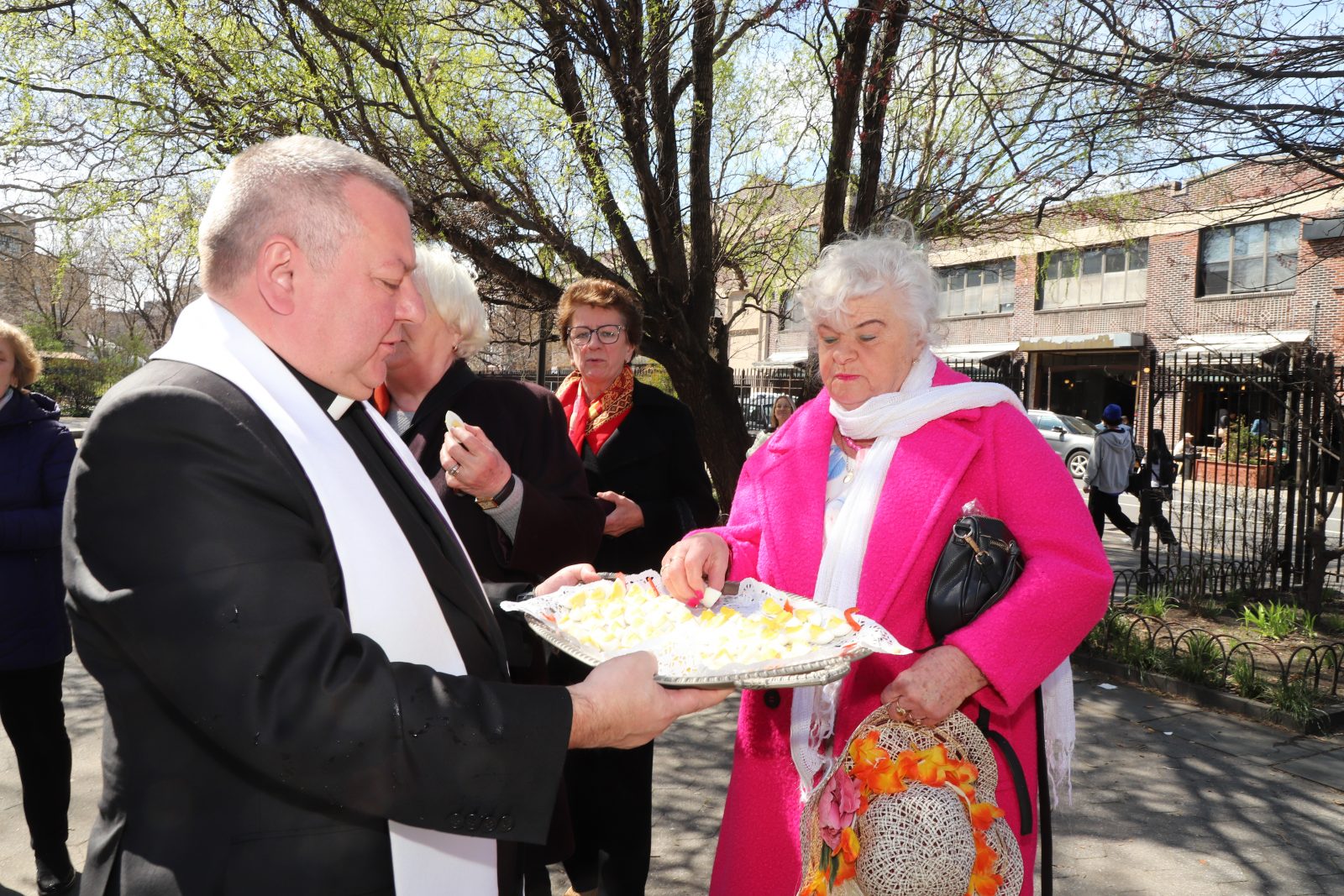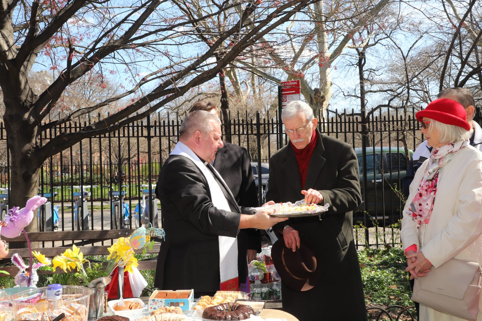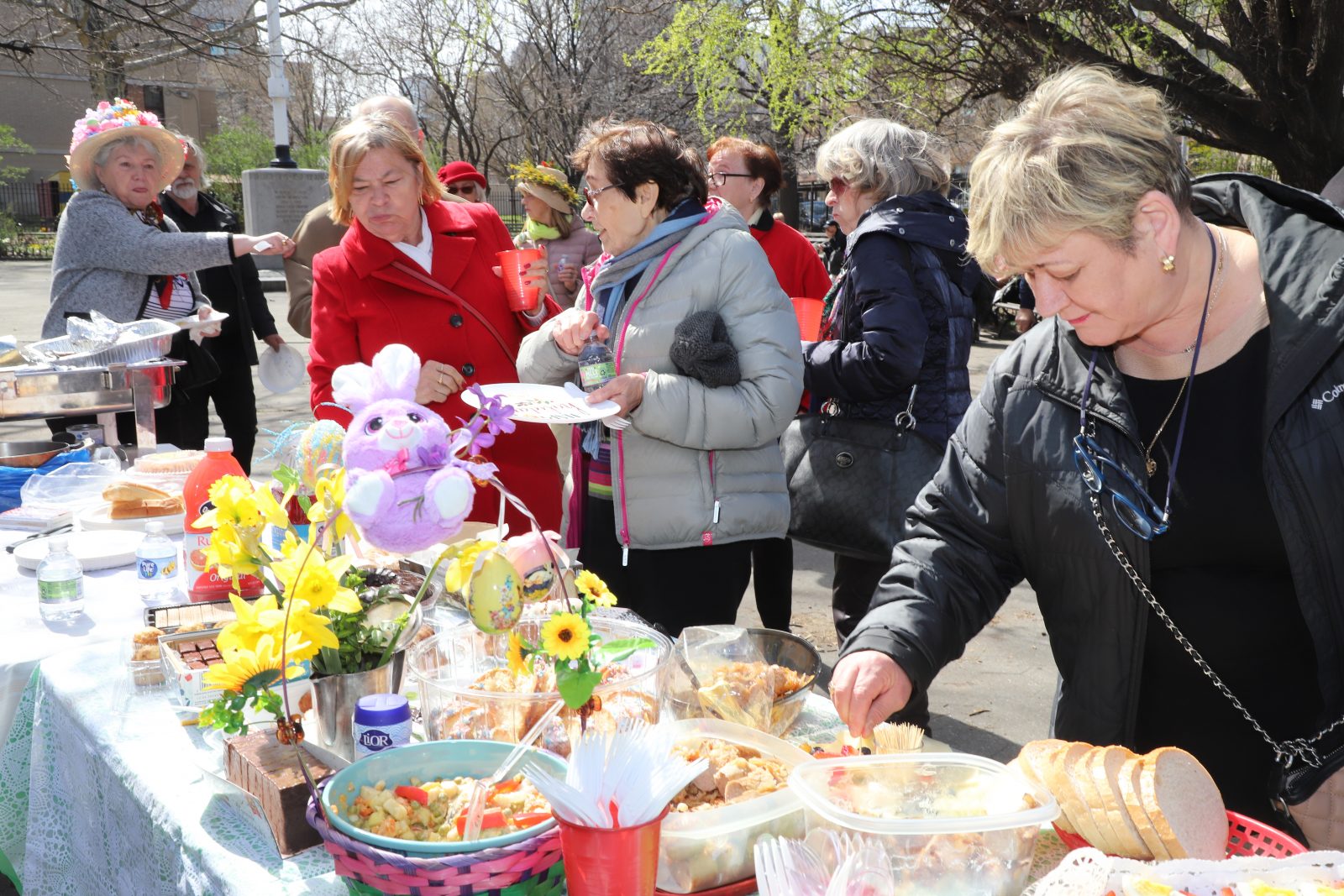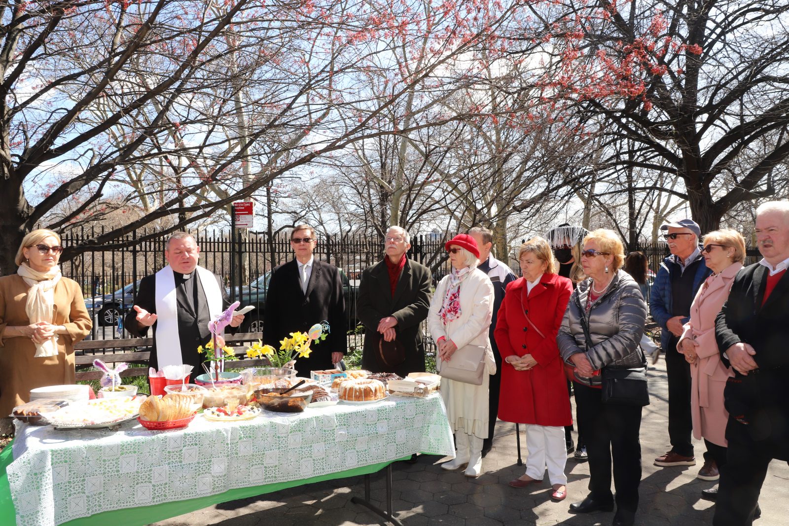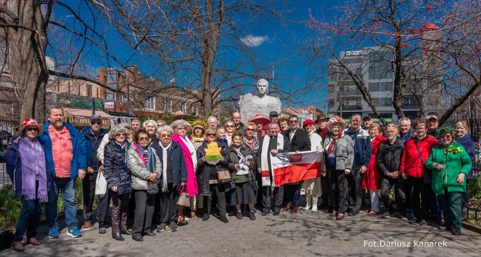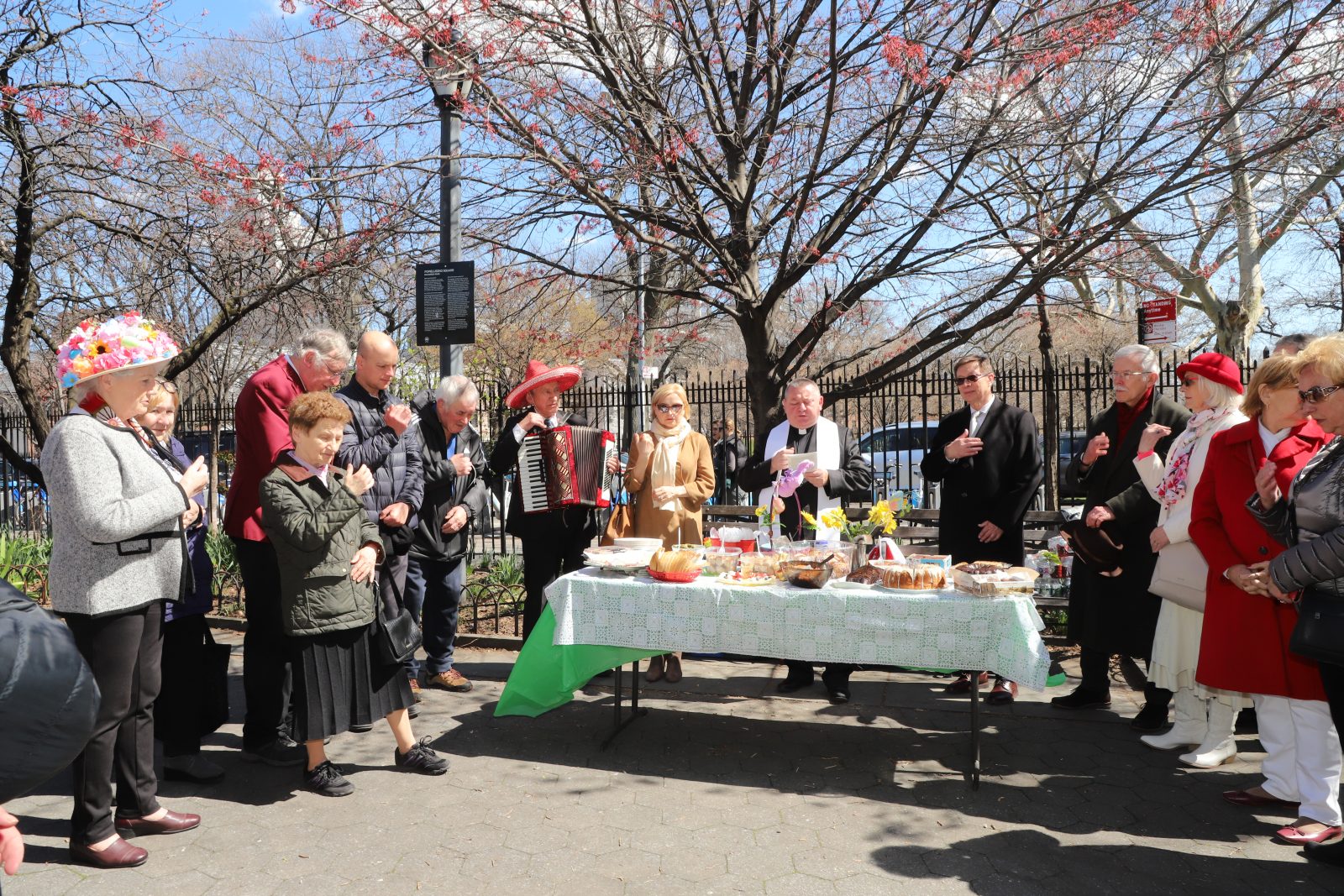 Z inicjatywy seniorów Klubu Krakus działającego w Centrum Polsko Słowiańskim, w niedzielę wielkanocną, 31 marca miało miejsce trzecie już spotkanie przy pomniku księdza Jerzego Popiełuszki na Greenpoincie. Uczestniczyli w nim również członkowie Northside Senior Center z Williamsburga, znajomi oraz przygodni przechodnie. Obecnością swoją zaszczycili nas: prezes Centrum Polsko Słowiańskiego, Marian Żak z małżonką Małgorzatą, nowy prezes Polsko-Amerykańskiego Klubu Fotografika, Dariusz Kanarek, który przybył z ojcem, Krzysztofem Kanarkiem, byłym śpiewakiem z Mazowsza i solistą Operetki Warszawskiej. Zaproszony ksiądz Grzegorz Markulak, proboszcz Parafii Św. Stanisława Kostki na Greenpoincie powiedział „Po zakończeniu 40 dniowego czasu Wielkiego Postu gromadzimy się w Uroczystość Zmartwychwstania Pańskiego. W naszych sercach jest wielka radość, bo Chrystus żyje i jest pośród nas. Razem z nim jesteśmy tu w tej wspólnocie przy Wielkanocnym stole, by dzielić się miłością, składać sobie wzajemnie życzenia, dzielić się poświęconym jajkiem, znakiem nowego życia. Prośmy Chrystusa zawsze obecnego wśród tych, którzy Go miłują, aby pobłogosławił pokarmy na naszym wielkanocnym stole”. Po odmówieniu Litanii dziękczynnej i modlitwy poświęcił pokarmy wielkanocne oraz pobłogosławił zebranych.
