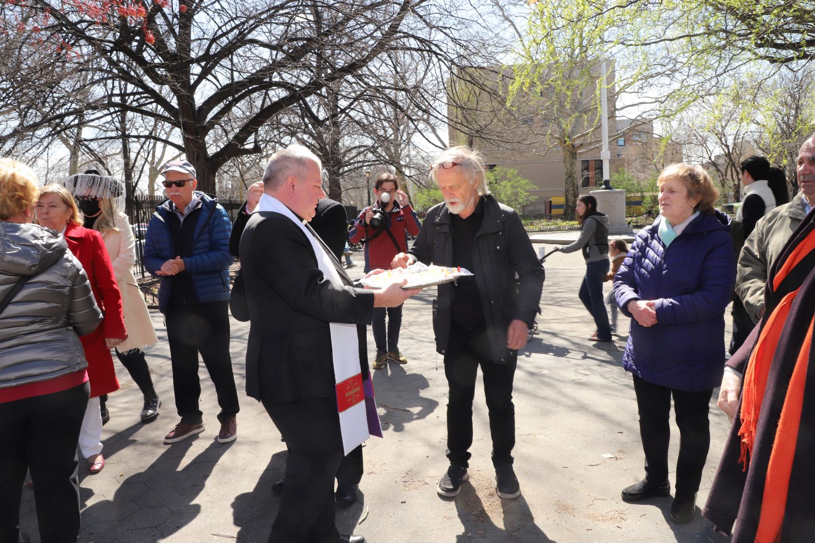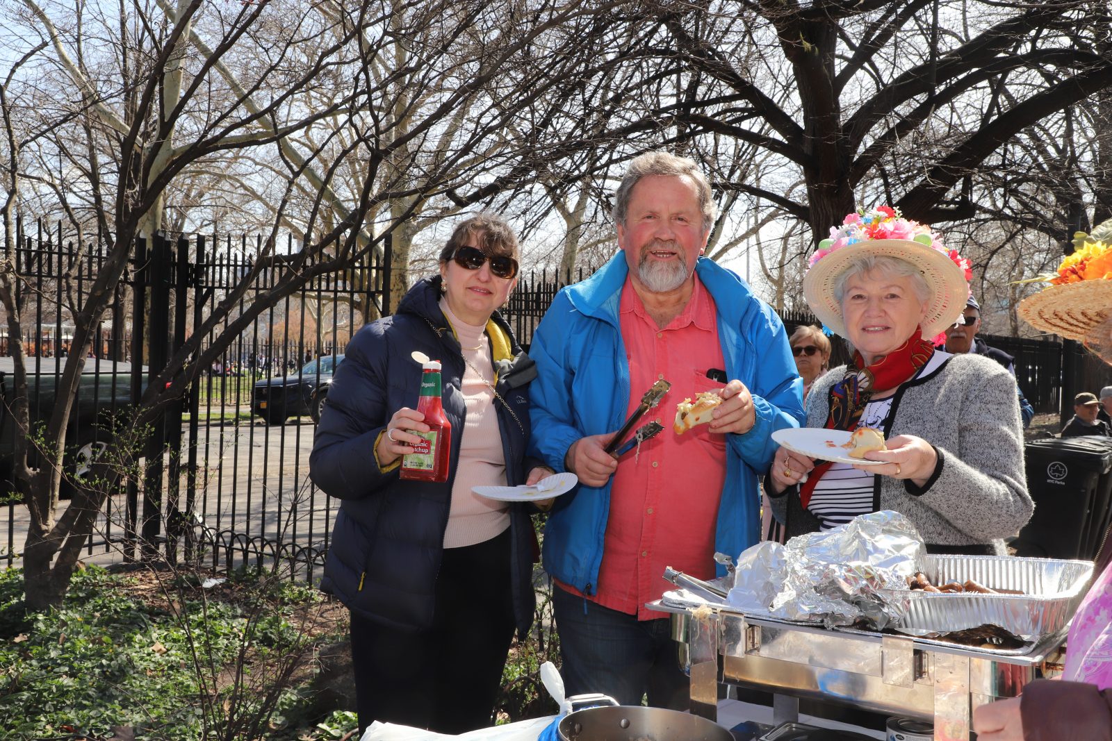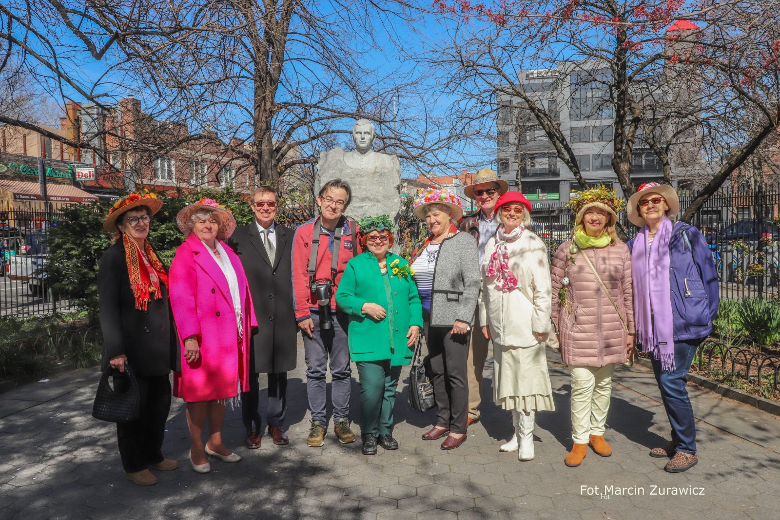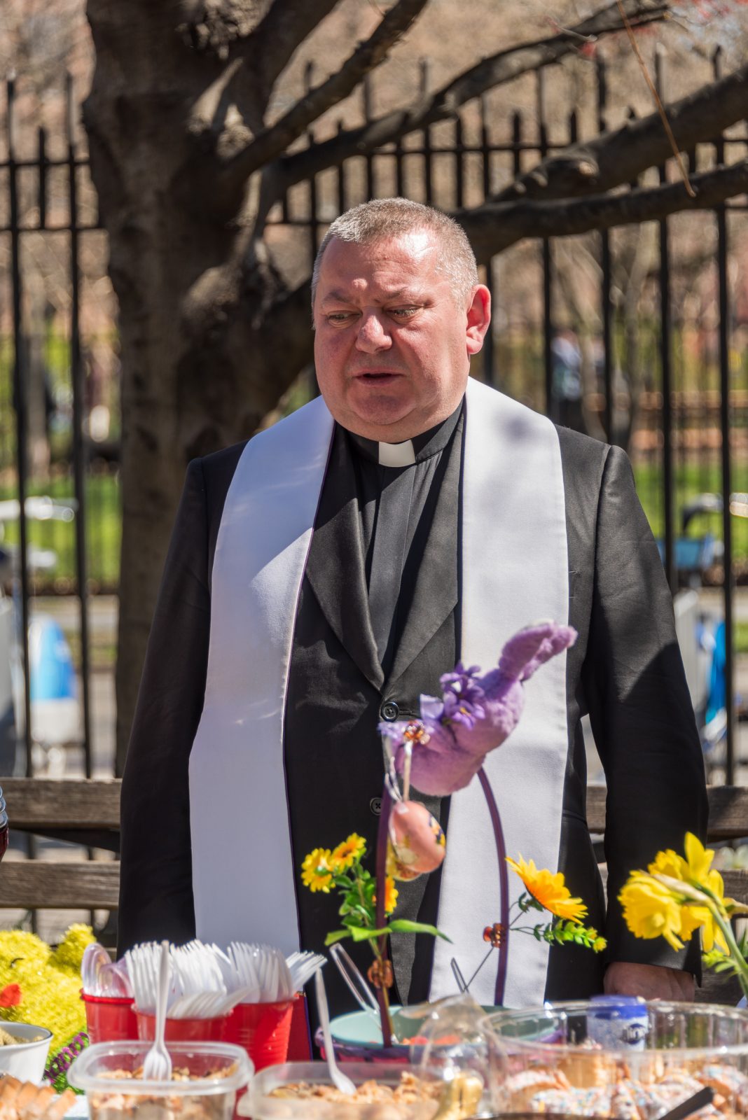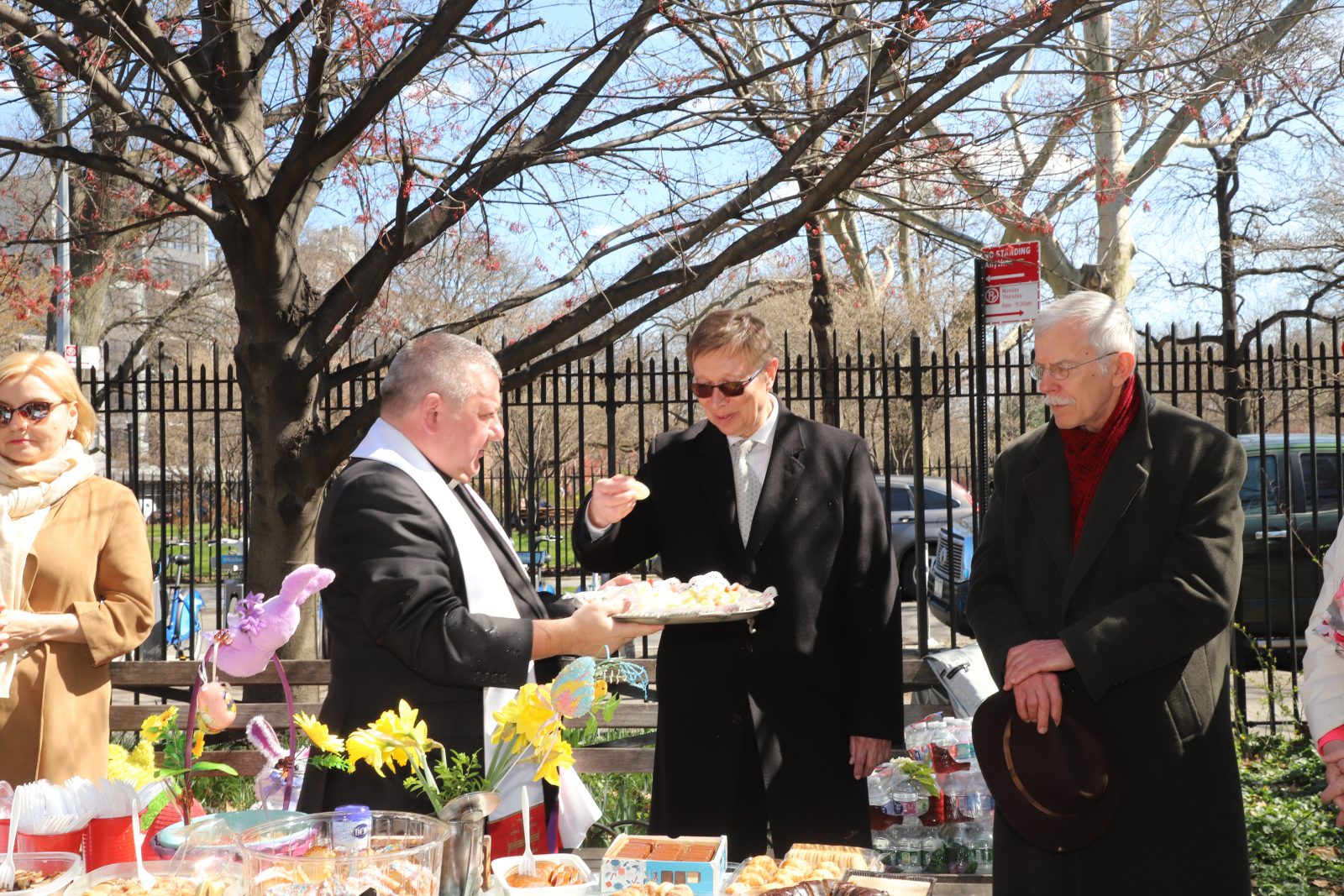 Z inicjatywy seniorów Klubu Krakus działającego w Centrum Polsko Słowiańskim, w niedzielę wielkanocną, 31 marca miało miejsce trzecie już spotkanie przy pomniku księdza Jerzego Popiełuszki na Greenpoincie. Uczestniczyli w nim również członkowie Northside Senior Center z Williamsburga, znajomi oraz przygodni przechodnie. Obecnością swoją zaszczycili nas: prezes Centrum Polsko Słowiańskiego, Marian Żak z małżonką Małgorzatą, nowy prezes Polsko-Amerykańskiego Klubu Fotografika, Dariusz Kanarek, który przybył z ojcem, Krzysztofem Kanarkiem, byłym śpiewakiem z Mazowsza i solistą Operetki Warszawskiej. Zaproszony ksiądz Grzegorz Markulak, proboszcz Parafii Św. Stanisława Kostki na Greenpoincie powiedział „Po zakończeniu 40 dniowego czasu Wielkiego Postu gromadzimy się w Uroczystość Zmartwychwstania Pańskiego. W naszych sercach jest wielka radość, bo Chrystus żyje i jest pośród nas. Razem z nim jesteśmy tu w tej wspólnocie przy Wielkanocnym stole, by dzielić się miłością, składać sobie wzajemnie życzenia, dzielić się poświęconym jajkiem, znakiem nowego życia. Prośmy Chrystusa zawsze obecnego wśród tych, którzy Go miłują, aby pobłogosławił pokarmy na naszym wielkanocnym stole”. Po odmówieniu Litanii dziękczynnej i modlitwy poświęcił pokarmy wielkanocne oraz pobłogosławił zebranych.