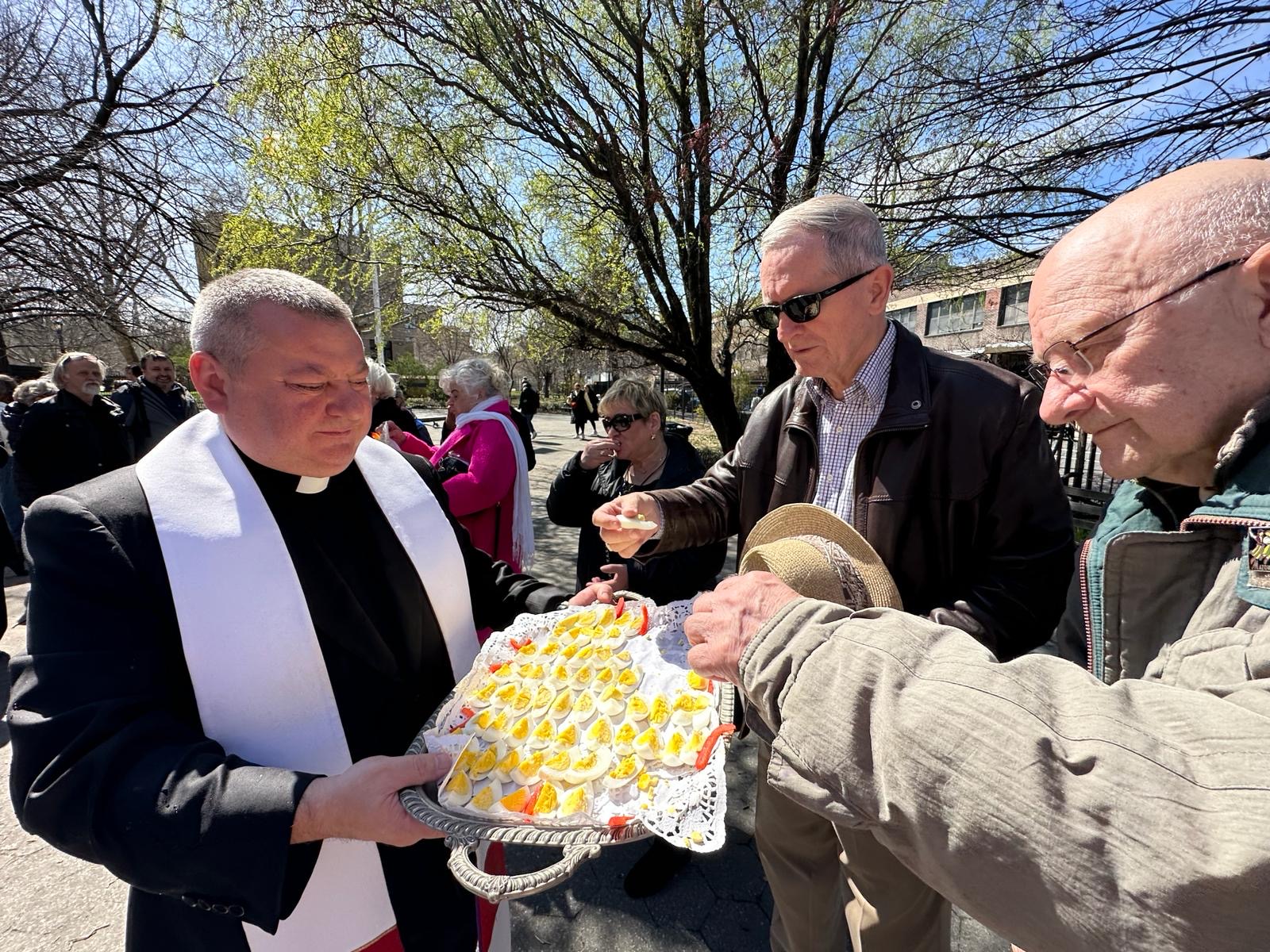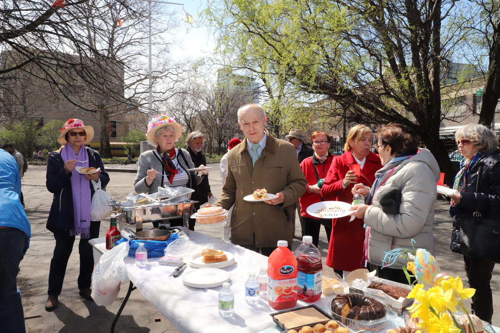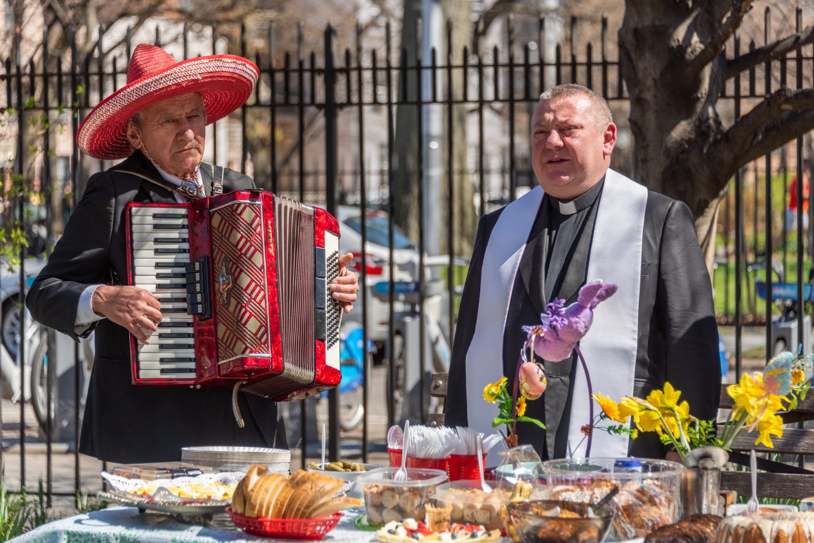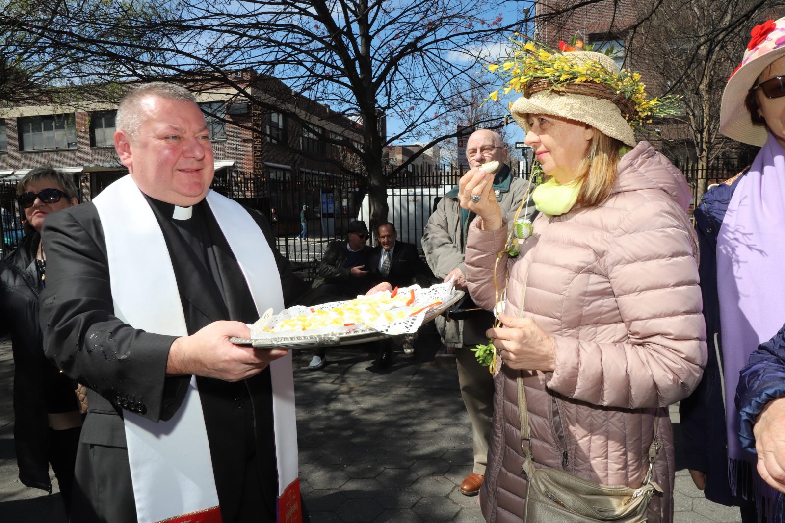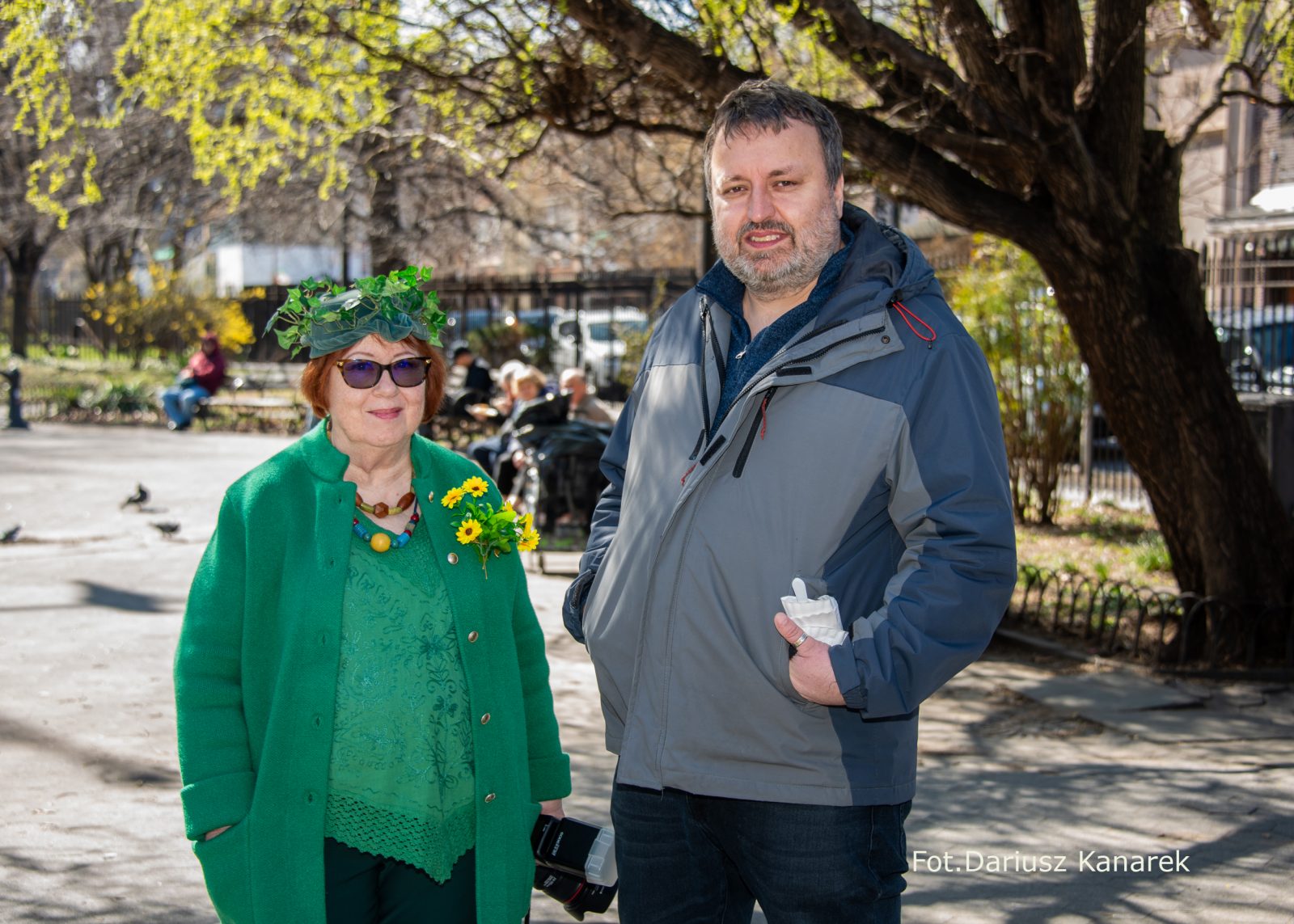Z inicjatywy seniorów Klubu Krakus działającego w Centrum Polsko Słowiańskim, w niedzielę wielkanocną, 31 marca miało miejsce trzecie już spotkanie przy pomniku księdza Jerzego Popiełuszki na Greenpoincie. Uczestniczyli w nim również członkowie Northside Senior Center z Williamsburga, znajomi oraz przygodni przechodnie. Obecnością swoją zaszczycili nas: prezes Centrum Polsko Słowiańskiego, Marian Żak z małżonką Małgorzatą, nowy prezes Polsko-Amerykańskiego Klubu Fotografika, Dariusz Kanarek, który przybył z ojcem, Krzysztofem Kanarkiem, byłym śpiewakiem z Mazowsza i solistą Operetki Warszawskiej. Zaproszony ksiądz Grzegorz Markulak, proboszcz Parafii Św. Stanisława Kostki na Greenpoincie powiedział „Po zakończeniu 40 dniowego czasu Wielkiego Postu gromadzimy się w Uroczystość Zmartwychwstania Pańskiego. W naszych sercach jest wielka radość, bo Chrystus żyje i jest pośród nas. Razem z nim jesteśmy tu w tej wspólnocie przy Wielkanocnym stole, by dzielić się miłością, składać sobie wzajemnie życzenia, dzielić się poświęconym jajkiem, znakiem nowego życia. Prośmy Chrystusa zawsze obecnego wśród tych, którzy Go miłują, aby pobłogosławił pokarmy na naszym wielkanocnym stole”. Po odmówieniu Litanii dziękczynnej i modlitwy poświęcił pokarmy wielkanocne oraz pobłogosławił zebranych.