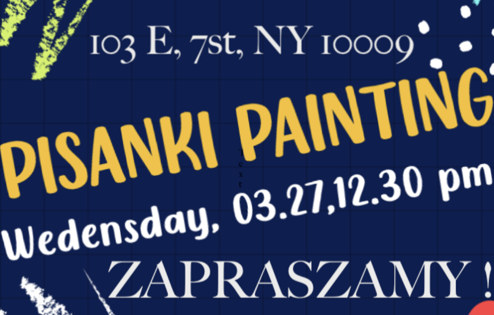 KLUB SENIORA-JP IIMalowanie Pisanek w Centrum JP2 na Manhattanie Posted on March 26, 2024 by Administrator Zapraszamy serdecznie do malowania Pisanek w Centrum JP2 działàjacym przy Centrum Polski Słowiańskim. Zajęcia poprowadzi Sofiya Pidzyralo – dyrektorka Settlement Centre – Village NORC na East Village. ZAPRASZAMY w środę 27 marca 12.30.