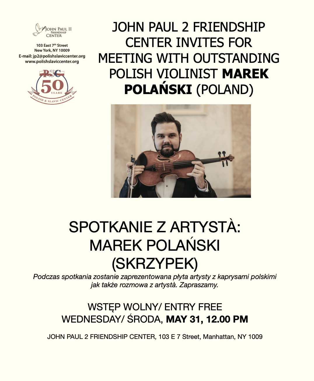 Marek Polański urodził się w 1986 r. w Krakowie. Ukończył z wyróżnieniem OSM I st. im. I.J. Paderewskiego w klasie skrzypiec prof. Mieczysława Szlezera, następnie także z wyróżnieniem POSM II st. im. F. Chopina w klasie skrzypiec prof. Antoniego Cofalika. Ukończył z wyróżnieniem studia w Akademii Muzycznej w Krakowie w klasie skrzypiec prof. Wiesława Kwaśnego oraz obronił z wyróżnieniem pracę doktorską pod kierunkiem prof. Mieczysława Szlezera na macierzystej uczelni, uzyskując stopień naukowy doktora sztuk muzycznych. W 2017 r. otrzymał nagrodę Prezesa Rady Ministrów za wyróżnioną rozprawę doktorską, jako jedyny reprezentant dziedziny sztuk muzycznych. Studiował w Hochschule für Musik und Darstellende Kunst Mannheim w klasie prof. Romana Nodla w ramach Programu Stypendialnego Erasmus. Ukończył z wyróżnieniem studia podyplomowe na Universität für Musik und darstellende Kunst w Grazu, w klasie prof. Yair. Klessa, a także z oceną celującą studia podyplomowe na Akademii Muzycznej w Katowicach w klasie prof. Romana Lasockiego. Jest zwycięzcą i laureatem wielu konkursów o zasięgu międzynarodowym i ogólnopolskim m.in.: “EUTERPE” (Grand Prix – maksymalna nota 100 punktów), „Don Vincenzo Vitti” (Grand Prix), „Città di Barletta” (Grand Prix), Konkursu TVP S. A. „Dolina Kreatywna” (I nagroda), Festiwalu Młodych Instrumentalistów (I nagroda), Konkursu Bachowskiego im. S. Hajzera (II miejsce), VII Ogólnopolskiego Konkursu Młodych Skrzypków im. St. Serwaczyńskiego (V miejsce) i in.