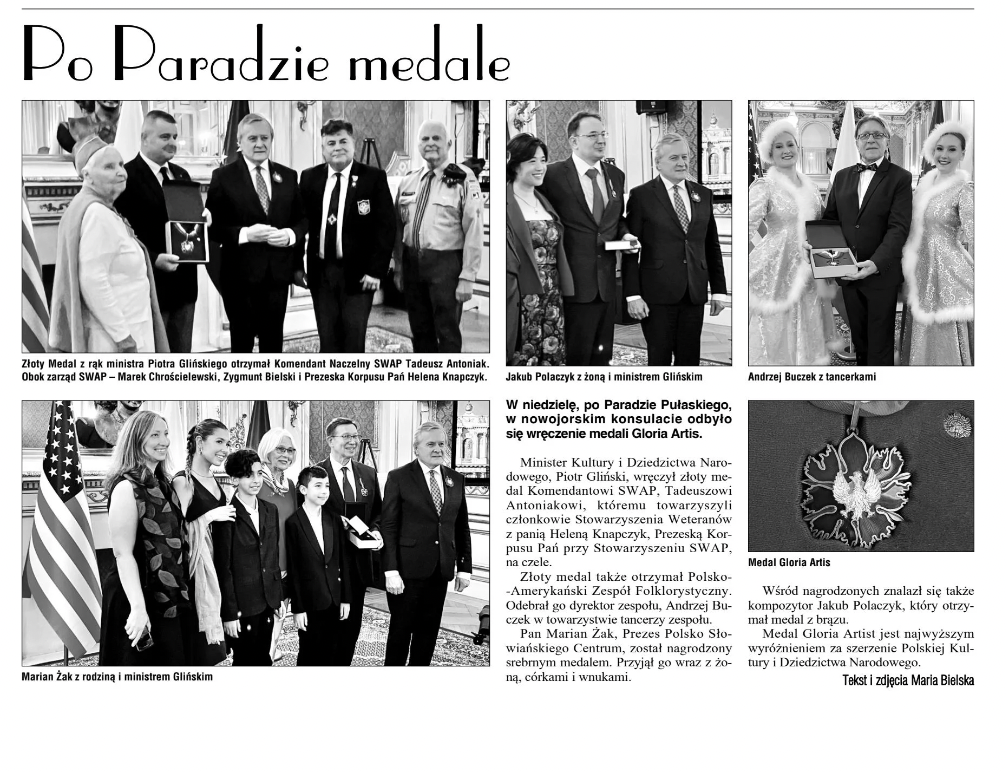 1 Października po Paradzie Pułaskiego, nadanie medali Gloria Artis w Polskim Konsulacie, pod nadzorem Konsula Stanisława Starnawskiego i Minister Kultury i Dziedzictwa Narodowego, Piotr Glińskiego, wręczyli medale Gloria Artis. Pan Marian Żak, Prezes Polsko Słowiańskiego Centrum, został nagrodzony srebrnym medalem. Pan Jakub Polaczyk otrzym