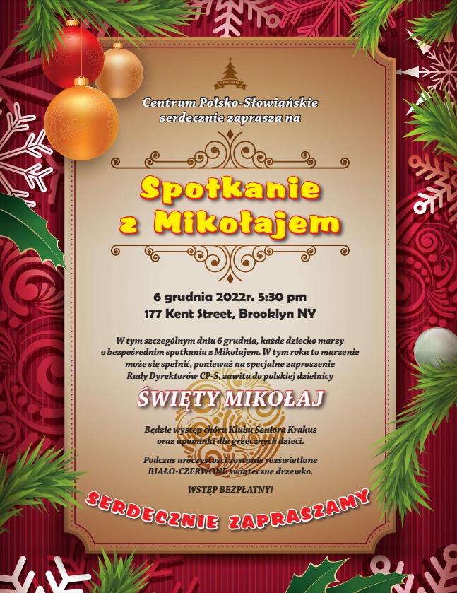 WIADOMOŚCIMikołajki w CPS – 6. grudnia – 177 Kent – 5:30 PM Posted on November 30, 2022January 26, 2023 by Administrator