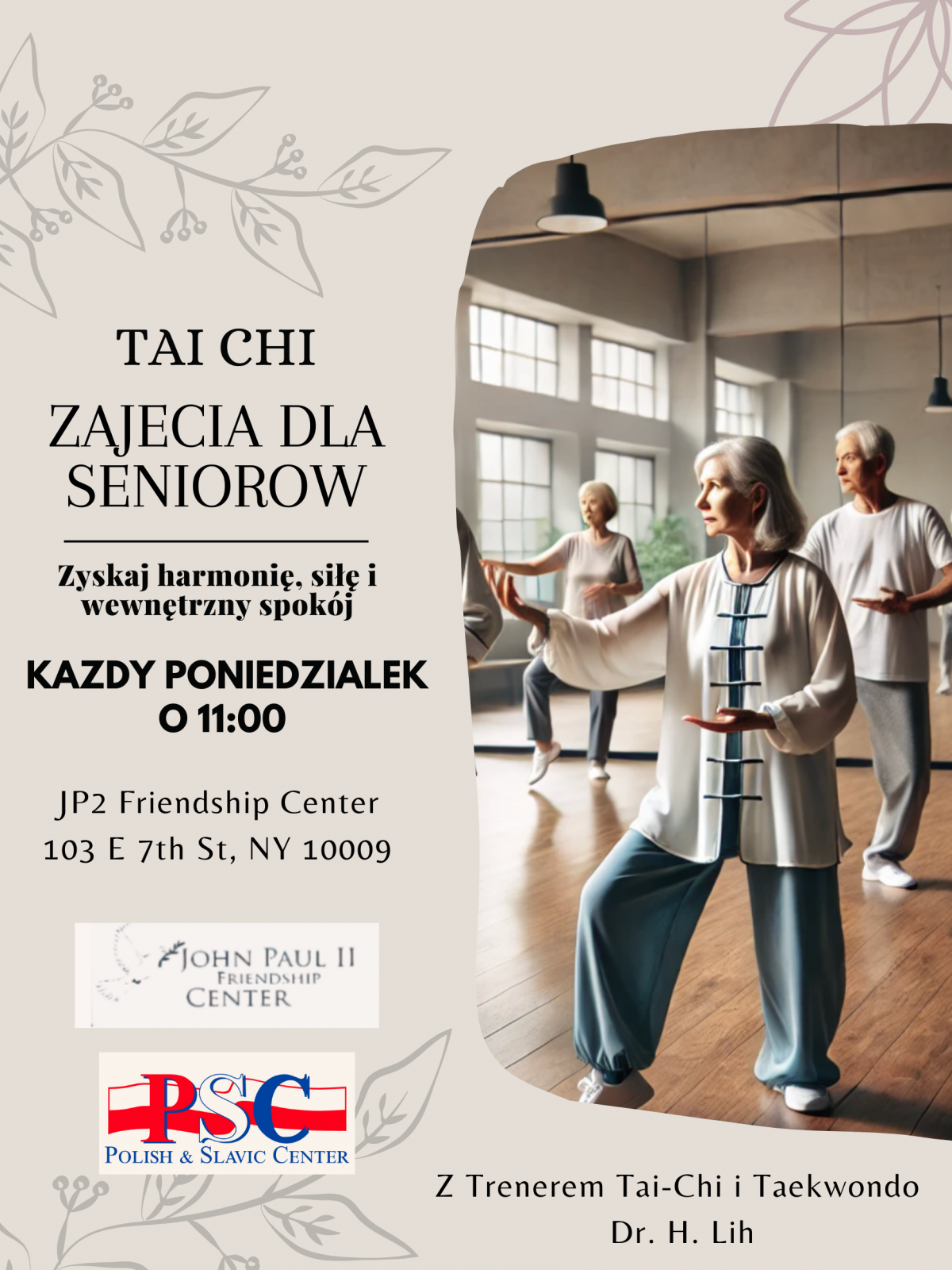 Zapraszamy wszystkich seniorów na nowe zajęcia Tai-Chi w Klubie JP2! To doskonała okazja, aby poprawić równowagę, zwiększyć elastyczność i wzmocnić ciało w przyjaznej atmosferze. Nie trzeba mieć wcześniejszego doświadczenia, wystarczy wygodny strój i chęć do ruchu! Serdecznie zapraszamy.