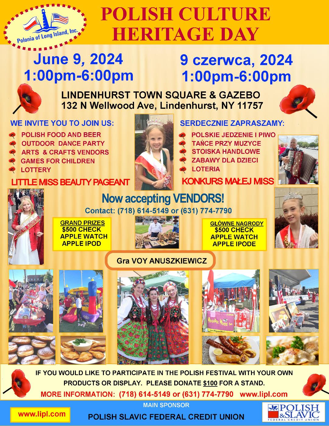 Serdecznie zapraszamy do wzięcia udziału w obchodach naszego corocznego Dnia Dziedzictwa Polskiego, sponsorowanego przez organizację non-profit Polonia of Long Island, Inc.