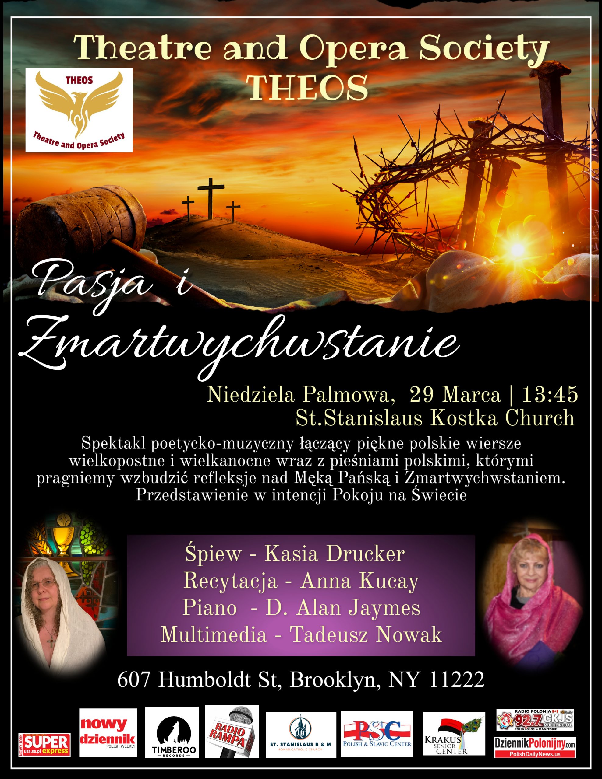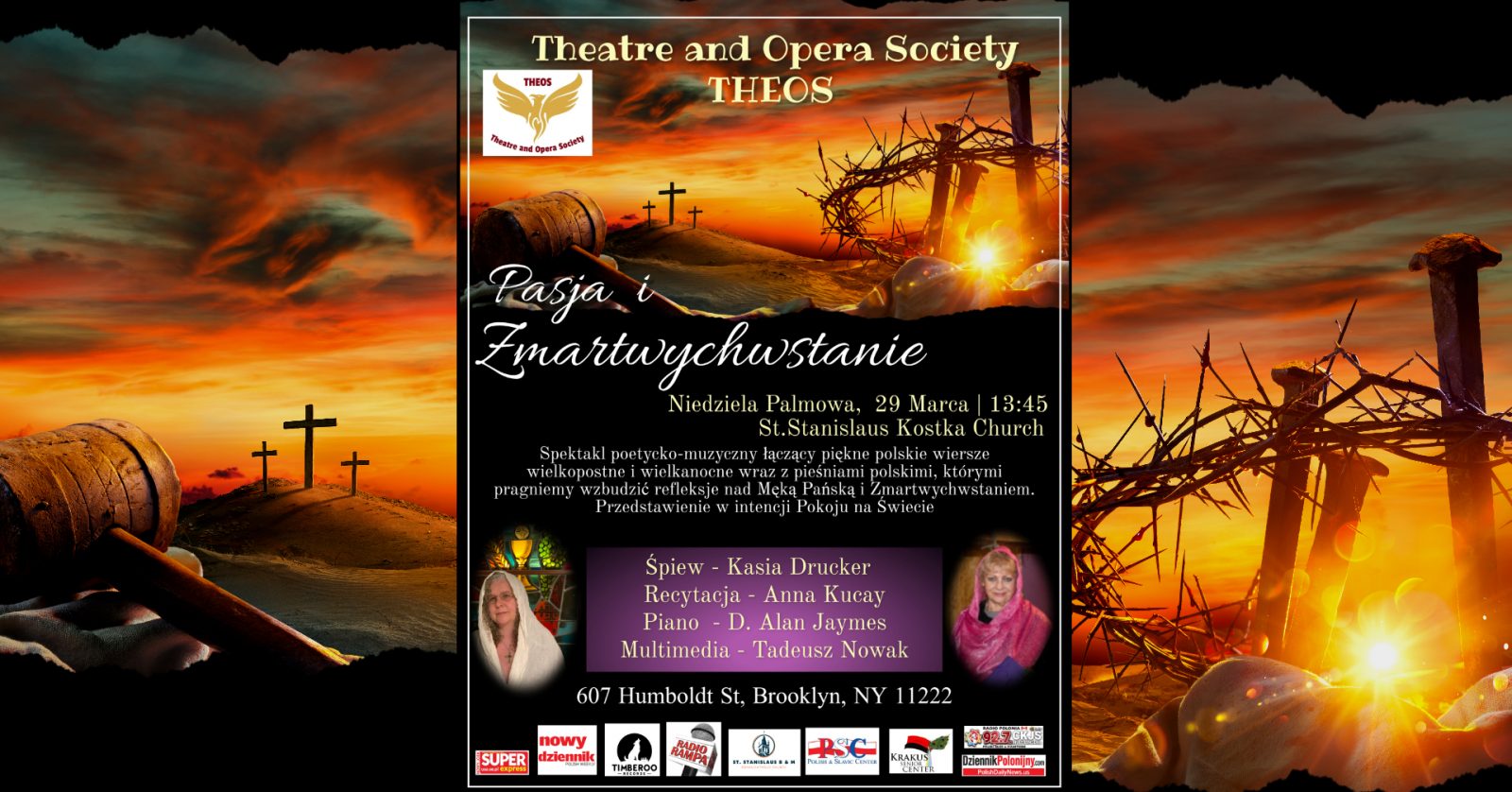 W Niedzielę Palmową, 29 marca, o godz. 13:45 w Kościele św. Stanisława Kostki na Greenpoincie THEOS Theatre and Opera Society zaprasza na poetycko‑wokalne przedstawienie „Pasja i Zmartwychwstanie”. Spektakl, wzbogacony elementami teatru greckiego, łączy piękne polskie wiersze wielkopostne i wielkanocne z tradycyjnymi pieśniami polskimi. W zestawieniu z klasycznymi utworami Pergolesiego i Schuberta w języku łacińskim przedstawienie pragnie skłonić do refleksji nad Męką Pańską Jezusa Chrystusa oraz tajemnicą Zmartwychwstania. Od kilku lat wydarzenie to na stałe wpisało się w kalendarz prezentacji artystycznych i cieszy się niezmiennym zainteresowaniem publiczności.