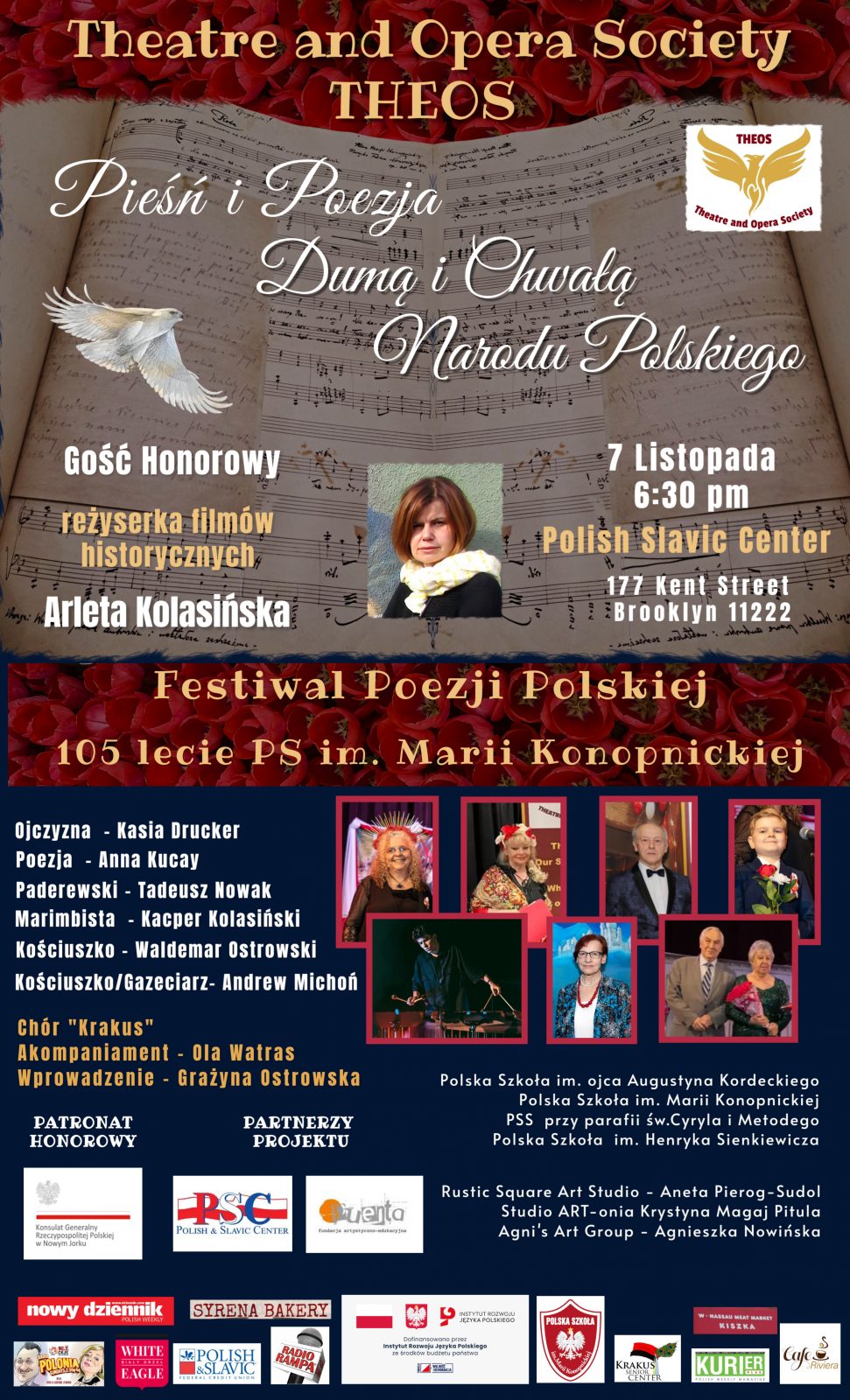 W Dniu 7 listopada o godz. 18: 30 „THEOS” – Theatre and Opera Society we współpracy z Centrum Polsko–Słowiańskim,w Galerii na 177 Kent Street, zapraszają na przedstawienie, “Pieśń i Poezja Dumą i Chwałą Narodu Polskiego – Festiwal Poezji Polskiej” pod patronatem honorowym Konsulatu Generalnego RP w Nowym Jorku. Program jest dofinansowany przez Fundację Wolność i Demokracja poprzez ogłoszony konkurs regrantingowy pn.„MINIGRANTY_2025”ze środków budżetu państwa.