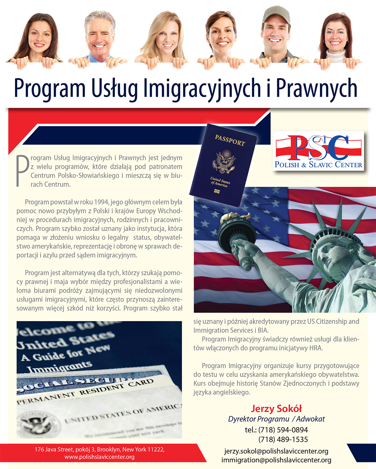 Wykwalifikowani pracownicy Programu Usług Imigracyjnych i Prawnych udzielają wyczerpujących informacji oraz pomagają w wypełnianiu podań i dokumentów imigracyjnych dotyczących: sponsorowania rodzinnego, obywatelstwa amerykańskiego, przedłużania zielonej karty, wizy turystycznej oraz „białego paszportu”.