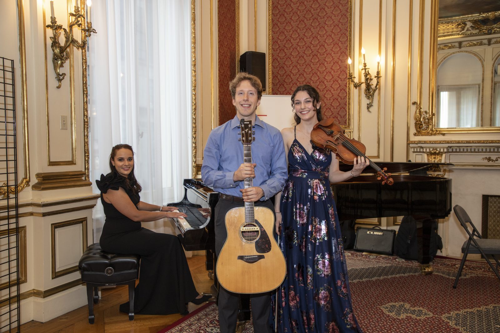 od lewej Violetta Maya Koss przy fortepianie, Adrian Koss, też wnuk Jerzego Kossa, gitara, Carolyn Carr, skrzypce.