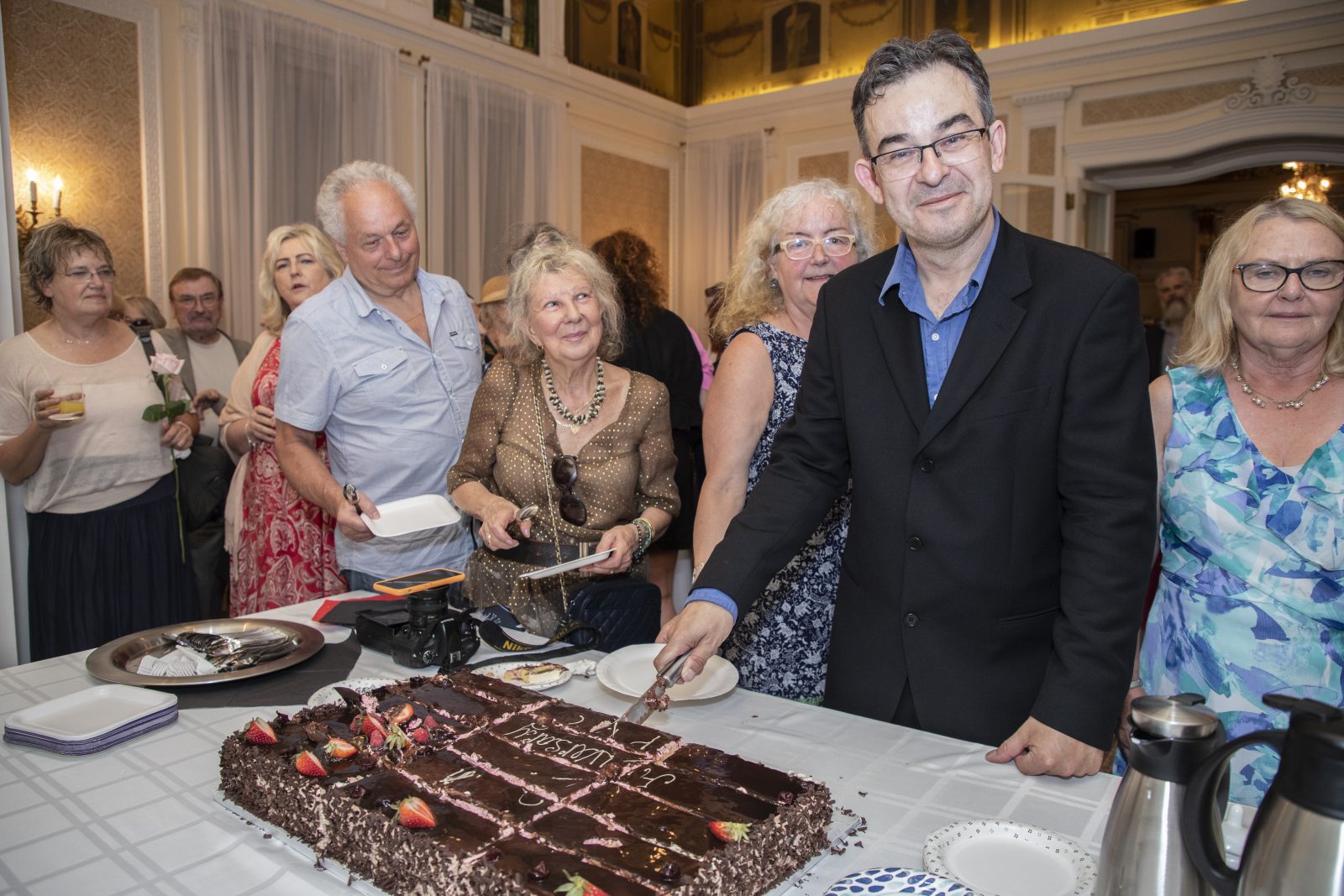 Dariusz Kanarek, nowy prezes Polsko Amerykańskiego Klubu Fotografika kroi tort jubileuszowy z Cafe Riviera