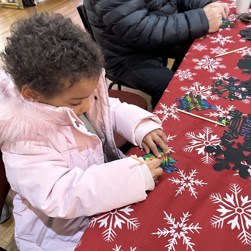 Szczególne miejsce na kiermaszu zajęło stoisko Klubu Seniora Krakus, gdzie nasi seniorzy z Art Class Krakus wspólnie z dziećmi tworzyli piękne ozdoby choinkowe. Były to wyjątkowe dekoracje, w których po zdrapaniu ukazywały się kolorowe wzory, co sprawiało ogromną radość najmłodszym uczestnikom i tworzyło prawdziwie międzypokoleniową atmosferę