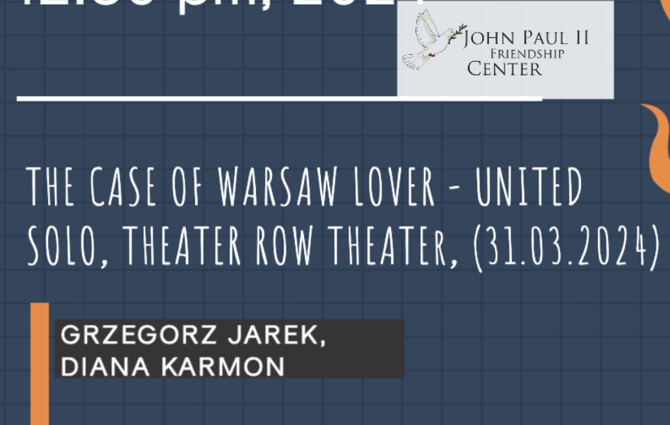Zapraszamy na spotkanie z reżyserkà i aktorem spektaklu “Case of Warsaw Lover” z Teatru Aktorów Zaangażowanych XL w Warszawie, który odbędzie się w niedzielę 31 marca na United Solo Festival na Broadway. Artyści przylatujà z Polski i udziela Polonii wywiadu w Centrum Polsko Słowińskim – Centrum JP2 na Manhattanie.
