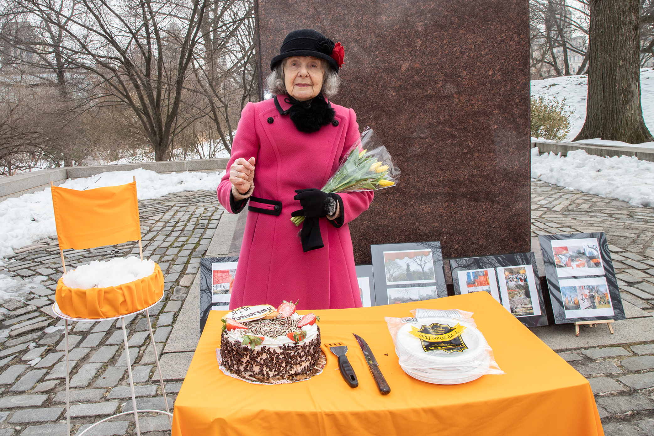 Był urodzinowy tort z Riviery oraz tort śniegowy z miniaturowymi bramami, mała wystawa zdjęć Sabiny oraz happening, pozowanie z inicjatorką spotkania w szafranowo- pomarańczowych materiałach.