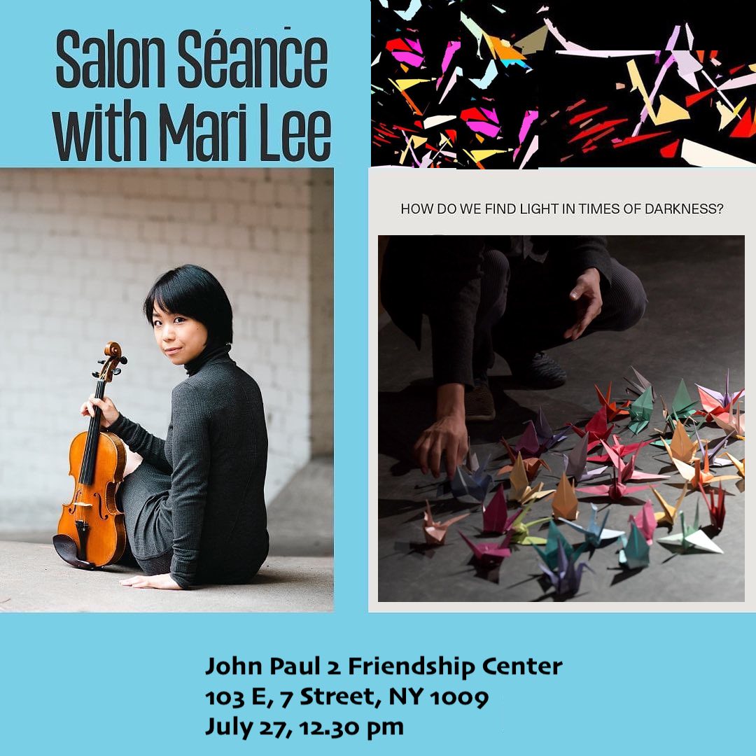 27 Lipca o 12.30 wybitna skrzypaczka o korzeniach japońsko – koreańskich – Mari Lee przedstawi warsztaty tworzenia origami do mistycznej muzyki Oliviera Messieana w ramach programów związanych z Salon Seance – innowatywnym teatrem którego jest założycielem. Teatr dziala w interakcji z publicznościa w odpowiedzi do doświadczeń muzycznych. Tytuł warszatotw : Jak znalezc swiatlo w czasach ciemnosci”. Zapraszamy na to wyjątkowe wydarzenie do Centrum JP2 na Manhattanite.