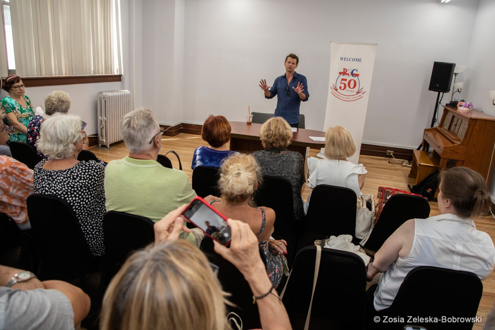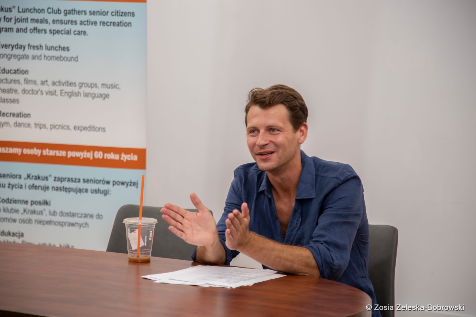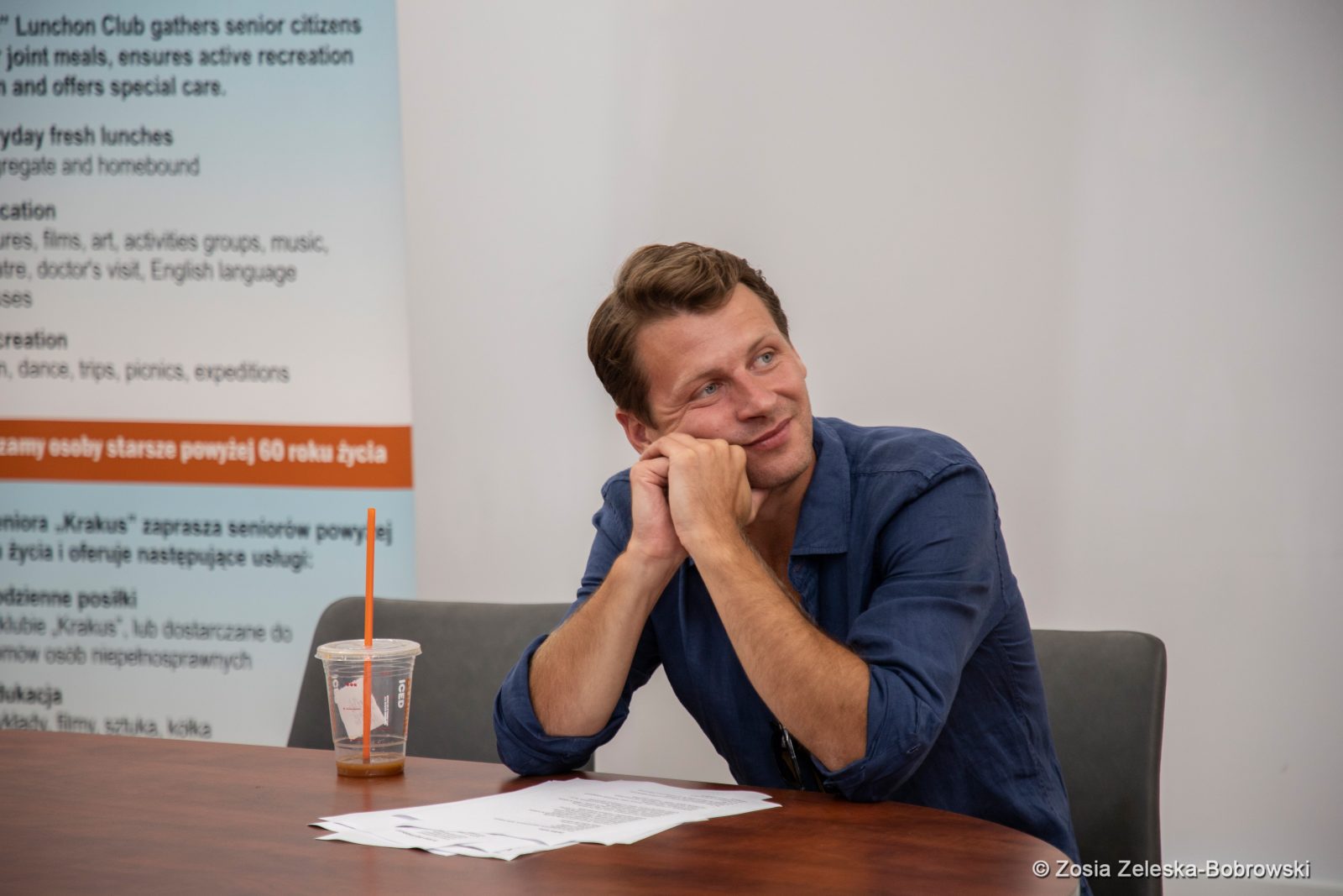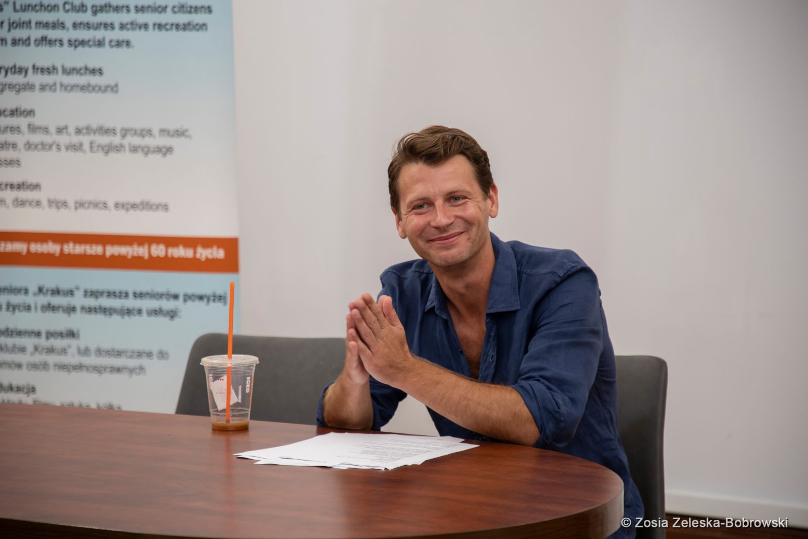 Po części poetyckiej nawiązała się rozmowa z aktorem. Przybyli byli ciekawi szczegółów pracy przy poszczególnych serialach, miejsc kręcenia scen, zwłaszcza słynnego „Stulecie Winnych” wg książki Ałbeny Grabowskiej.