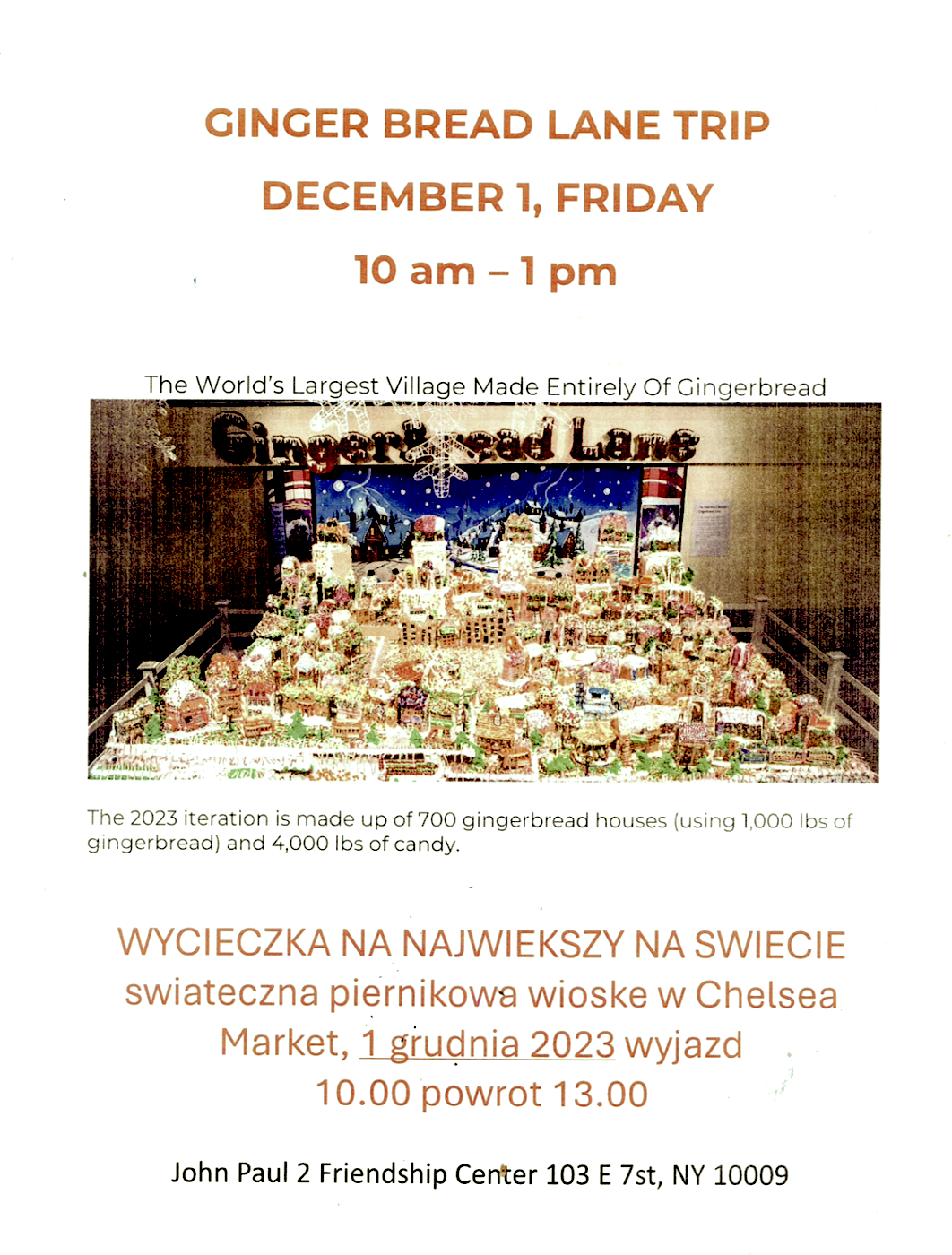 KLUB SENIORA-JP IIWycieczka do świątecznej wioski piernikowej na “Chelsea Market” – 1 Grudnia Posted on November 15, 2023November 29, 2023 by Administrator 1 Grudnia Centrum JP2 działające przy Centrum Polsko Słowiańskim planuje wycieczkę na Gingerbread Lane Trip. Wycieczka rozpoczyna się o 10.00 a powrót zaplanowany na godzinę 13.00.
