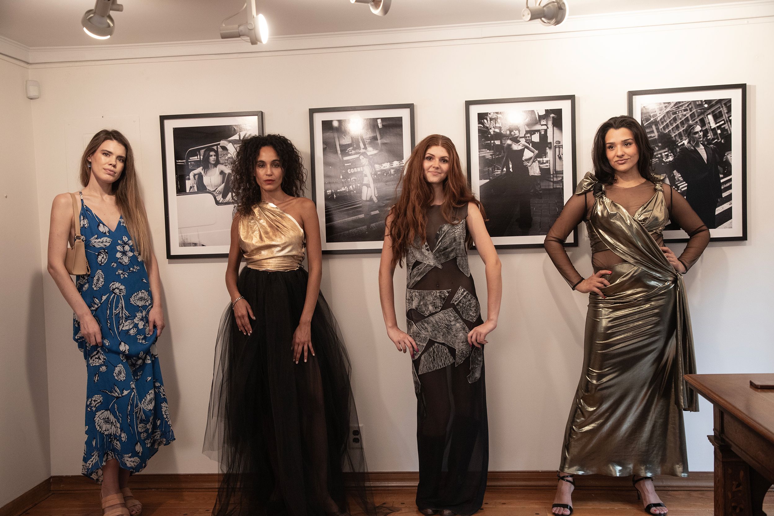 9869 – Od lewej: Brana Dane, kurator wystawy oraz modelki z Metropolis Artists Agency, Giordana Pieri, Ramona Gantz i Sarah Federman na tle fotografii Jeffa Kravitza