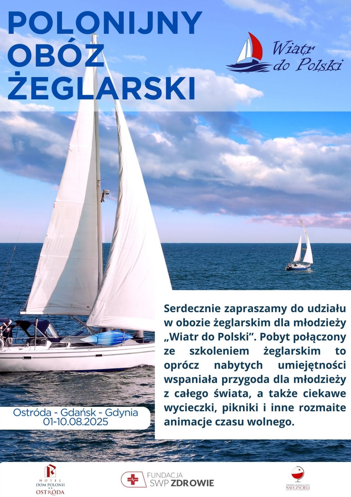 Serdecznie zapraszamy młodzież w wieku 14-18 lat do udziału w polonijnym obozie żeglarskim „Wiatr do Polski”. Pobyt w dniach 01-10.08.2025r. połączony ze szkoleniem żeglarskim to oprócz nabytych umiejętności wspaniała przygoda dla młodzieży z całego świata, a także ciekawe wycieczki, pikniki i inne rozmaite animacje czasu wolnego. Opcją dodatkową dla młodzieży jest możliwość ukończenia szkolenia online i przystąpienie do egzaminu na patent żeglarza jachtowego.