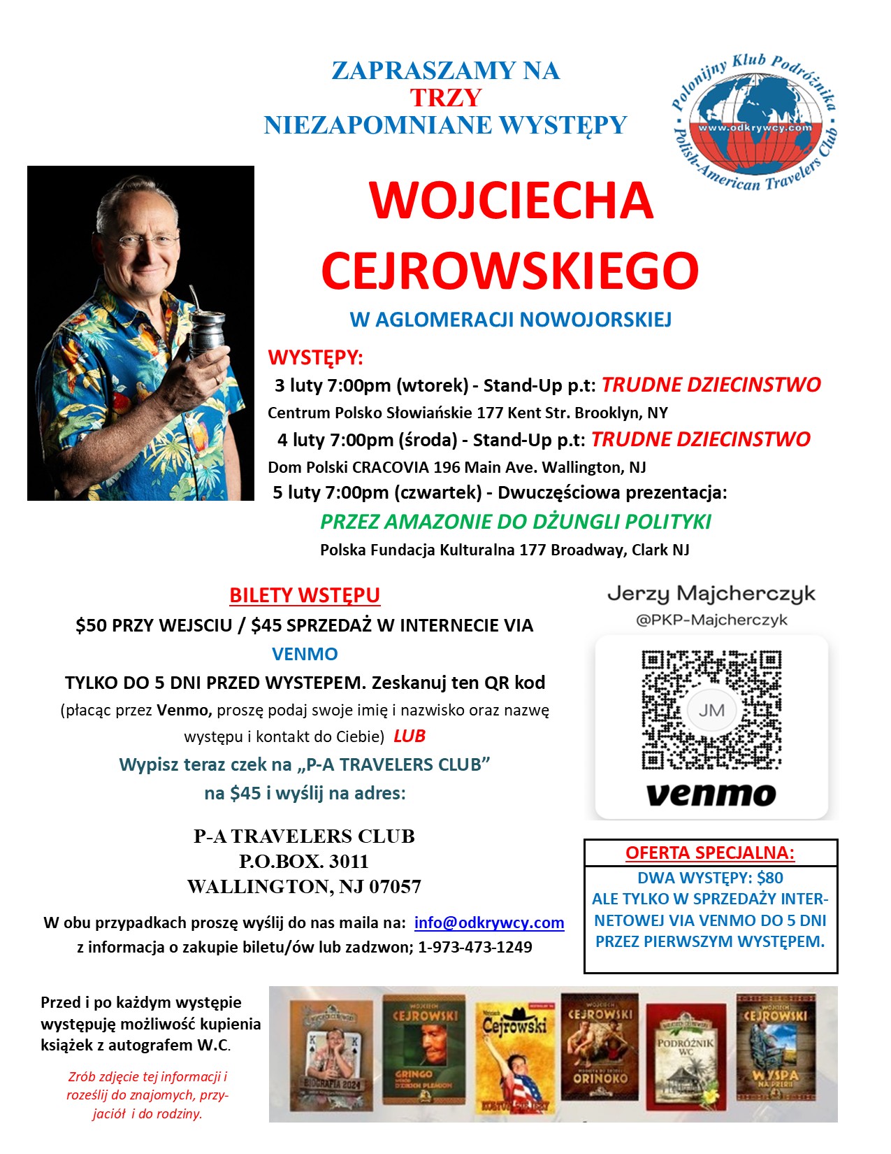 NADCHODZĄCE WYDARZENIAZapraszamy na występ Wojciecha Cejrowskiego – wtorek, 3 lutego godz. 7pm, 177 Kent Street Posted on January 8, 2026January 20, 2026 by Administrator https://youtube.com/shorts/1AuYybxfnG0?feature=share Zaproszenie – video