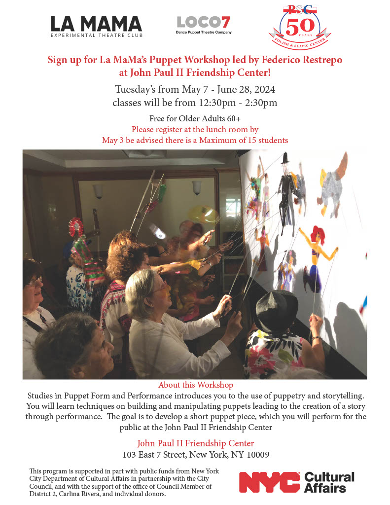 KLUB SENIORA-JP IIZapraszamy na zapisy do warsztatow z Teatrem Lalek z La Mama Posted on April 23, 2024April 25, 2024 by Administrator