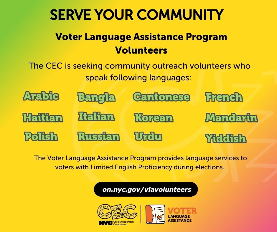 New York City Civic Engagement Commission poszukuje wolontariuszy mówiących w językach innych niż angielski np. po polsku do pomocy przy kampanii informacyjnej przed prawyborami. Minimum zaangażowania 3-4 godziny. Za poświęcony czas wolontariusze otrzymają karty podarunkowe (gift cards). Zgłoszenia: on.nyc.gov/vlavolunteers.